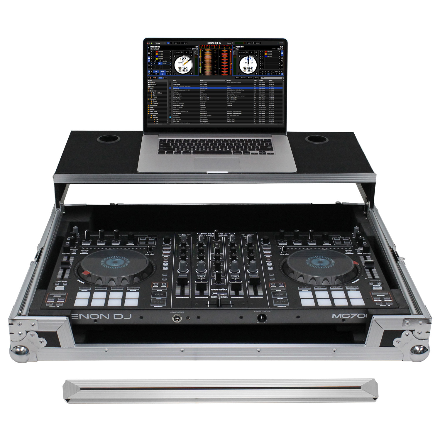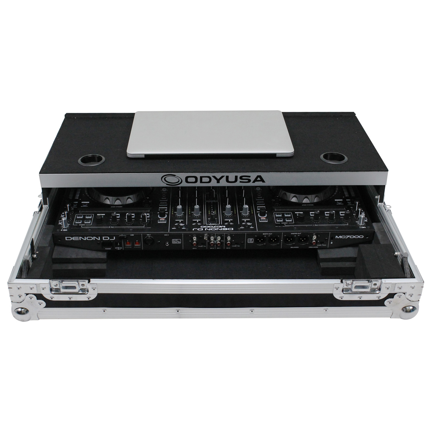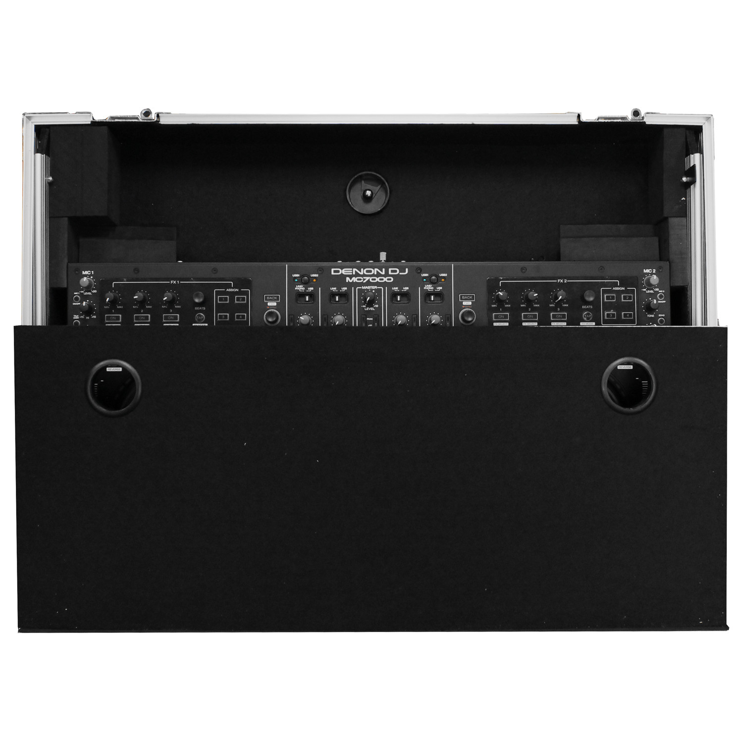 Specifically made for the Denon MC7000 DJ controller, it features a front stylish V-Cut' removable panel that allows for easy access to the headphones port and fader control knob. A spacious ventilation pit under the controller is ideal for storing cables and other accessories.