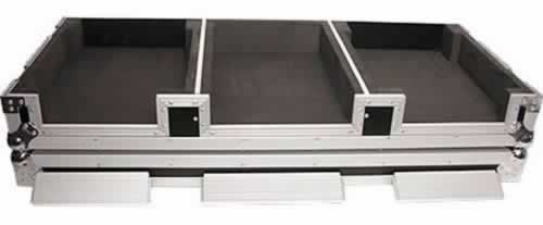 These CD DJ Coffins hold two large format tabletop CD players and one mixer. These ATA Rolling Coffins feature rugged built-in wheels, heavy duty spring-loaded latches, stackable ball corners, and front access panels. Cabling is clean and easy through convenient access ports throughout.