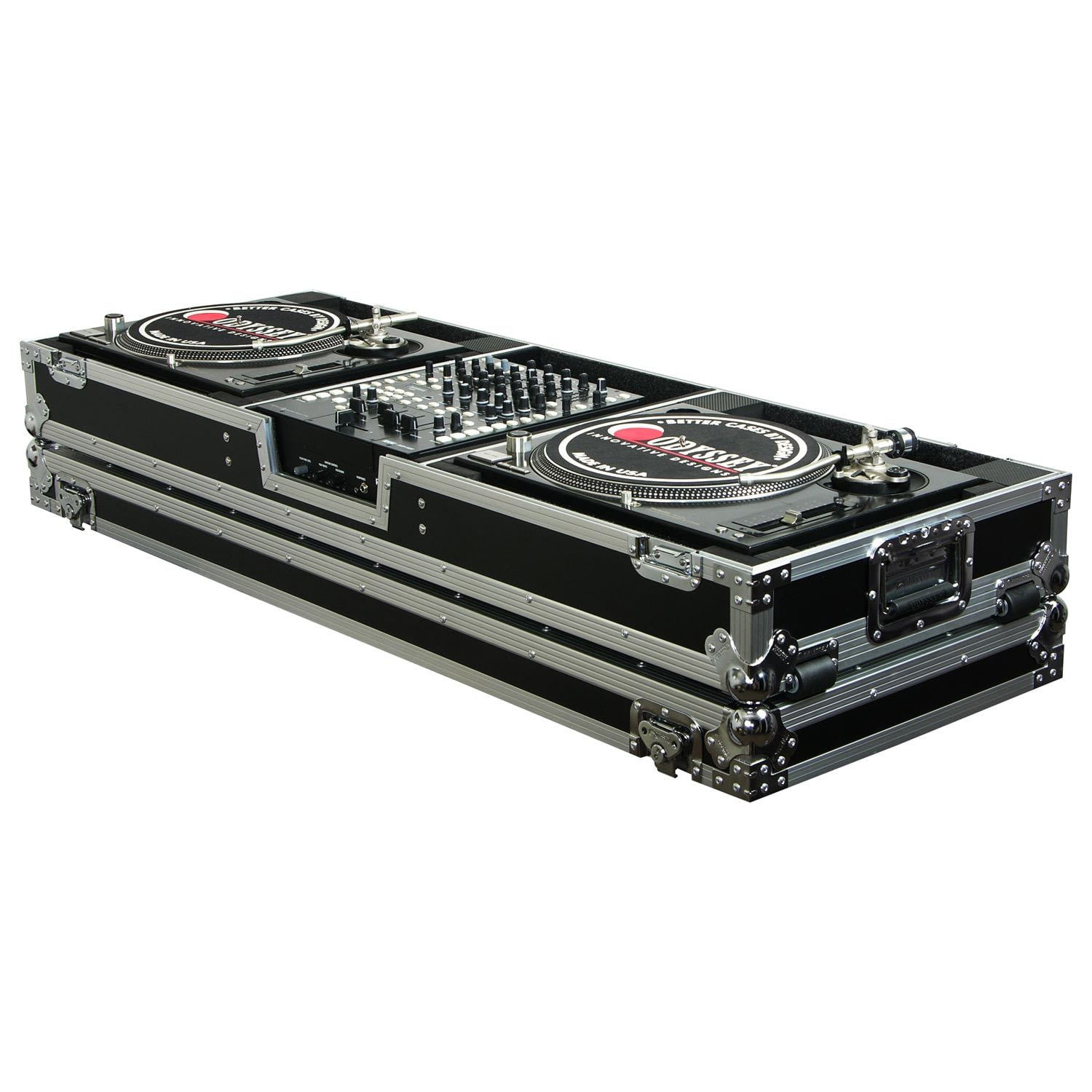 Our Classic FZDJ12W Pro DJ coffin holds one 12" format DJ mixer, and two 1200 style turntables in Standard position. Detachable lid included (not shown). Includes roller wheels for easy transport. Features include rugged built-in roller wheels, recessed latches and spring-loaded handles, heavy-duty ball corners, and a front mixer section V-cut' access panel. Cabling is clean and easy with convenient access ports throughout the rear of the case. Our turntable DJ coffins can accommodate Technics as well as Numark, Pioneer, Stanton, and similar sized turntables.