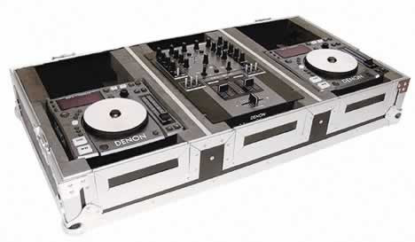 The ATA Console holds two Denon DNS1000 players and one DNX300 mixer or DNX100 mixer. This case features slide-out panels for CD bay and mixer control access. Heavy-duty steel ball corners, recessed handles and latches. Detachable lid included (not shown).