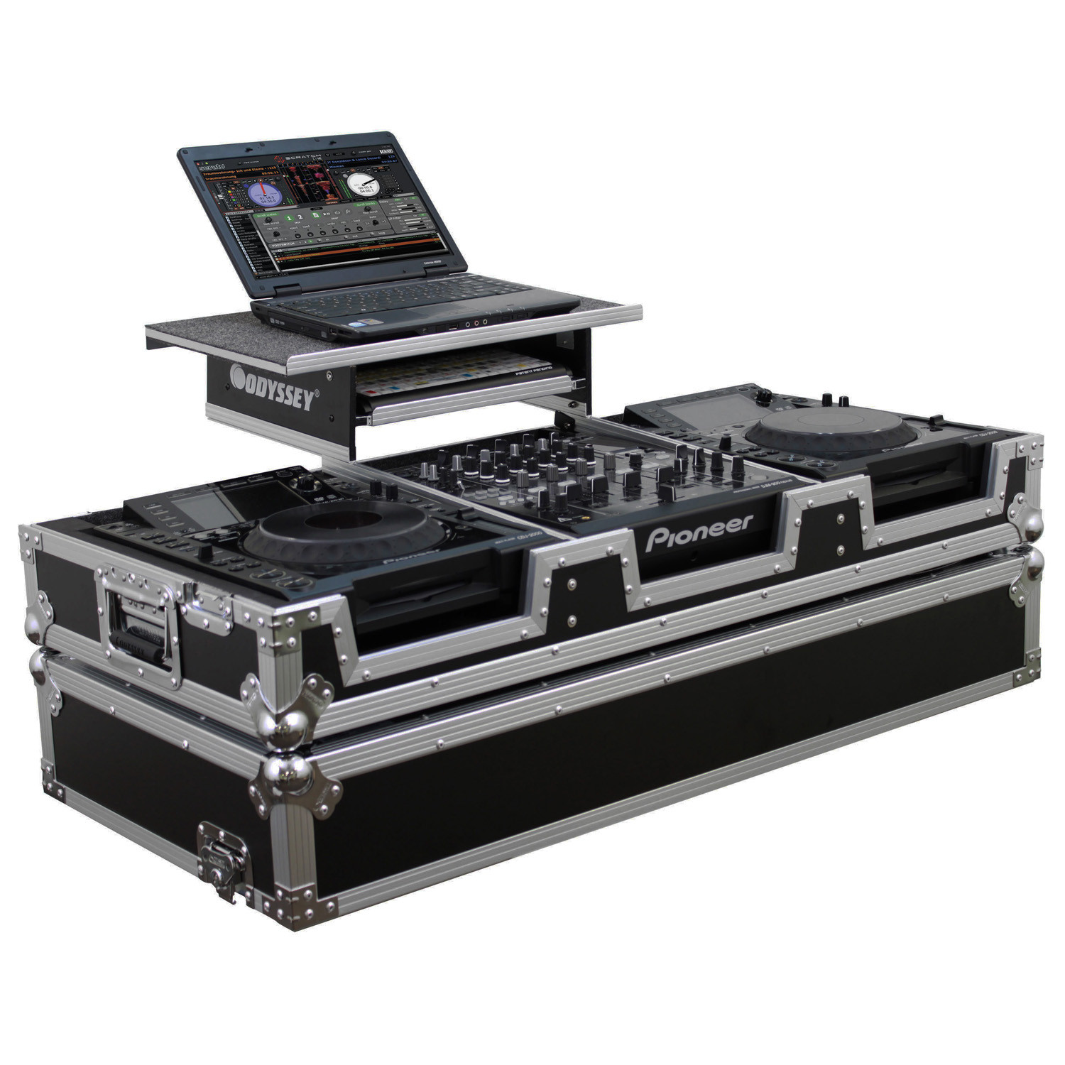 Odyssey Glide Style' Coffins hold two large format tabletop CD players and one mixer. Each compartment features a valley or pit as you might call it that allows for more ventilation of the gear as well as an area for cable management or storage. Other features include rugged built-in wheels, spring-loaded latches, heavy-duty ball corners, and front access panels. Cabling is clean and easy through convenient access ports throughout.
