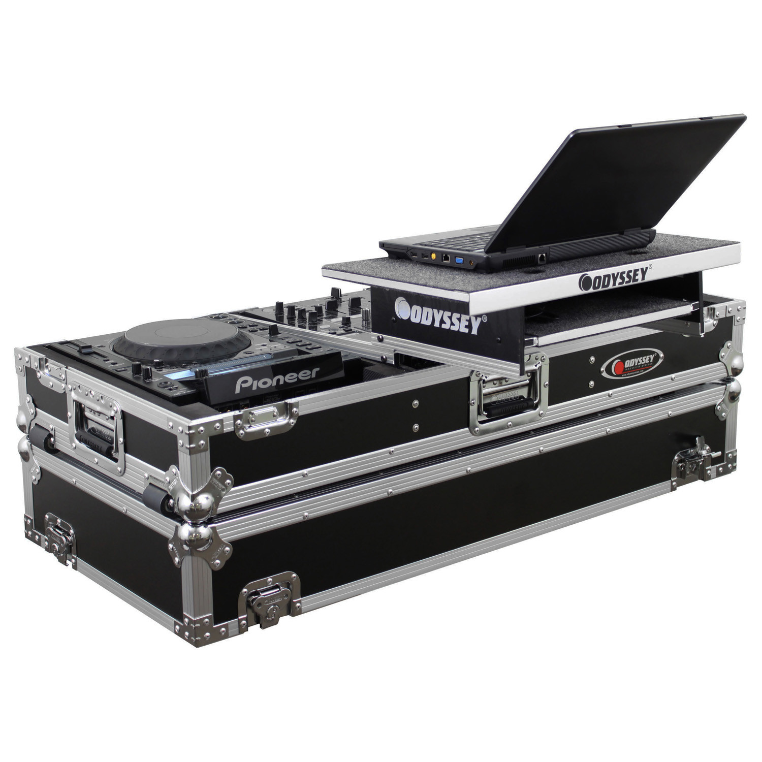 Odyssey Glide Style' CD/digital media coffins hold two large format tabletop CD/media players and one mixer. Each compartment features a bottom valley or pit that allows for more ventilation of the gear as well as an area for cable management or storage. Other features include rugged built-in wheels, spring-loaded latches, heavy-duty ball corners, and removable front access panels. Cabling is clean and easy through convenient access ports throughout.