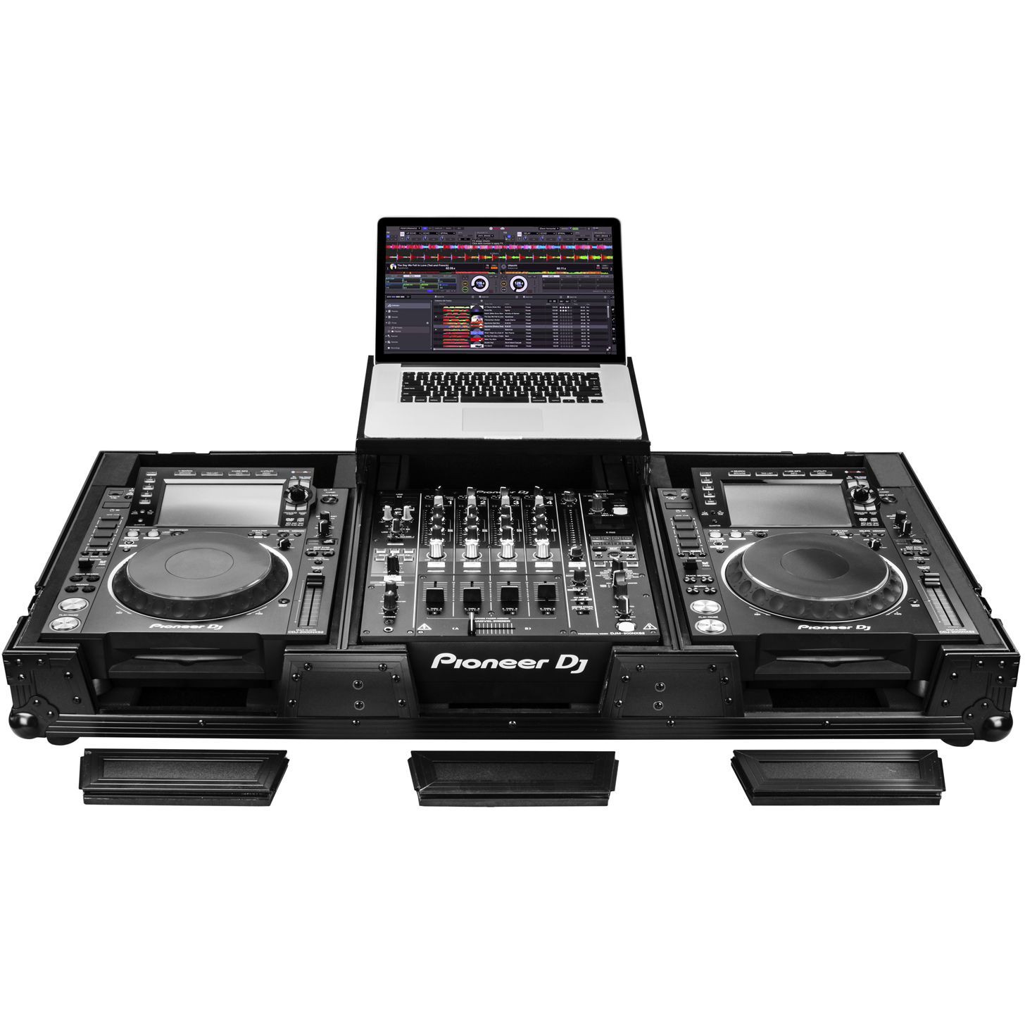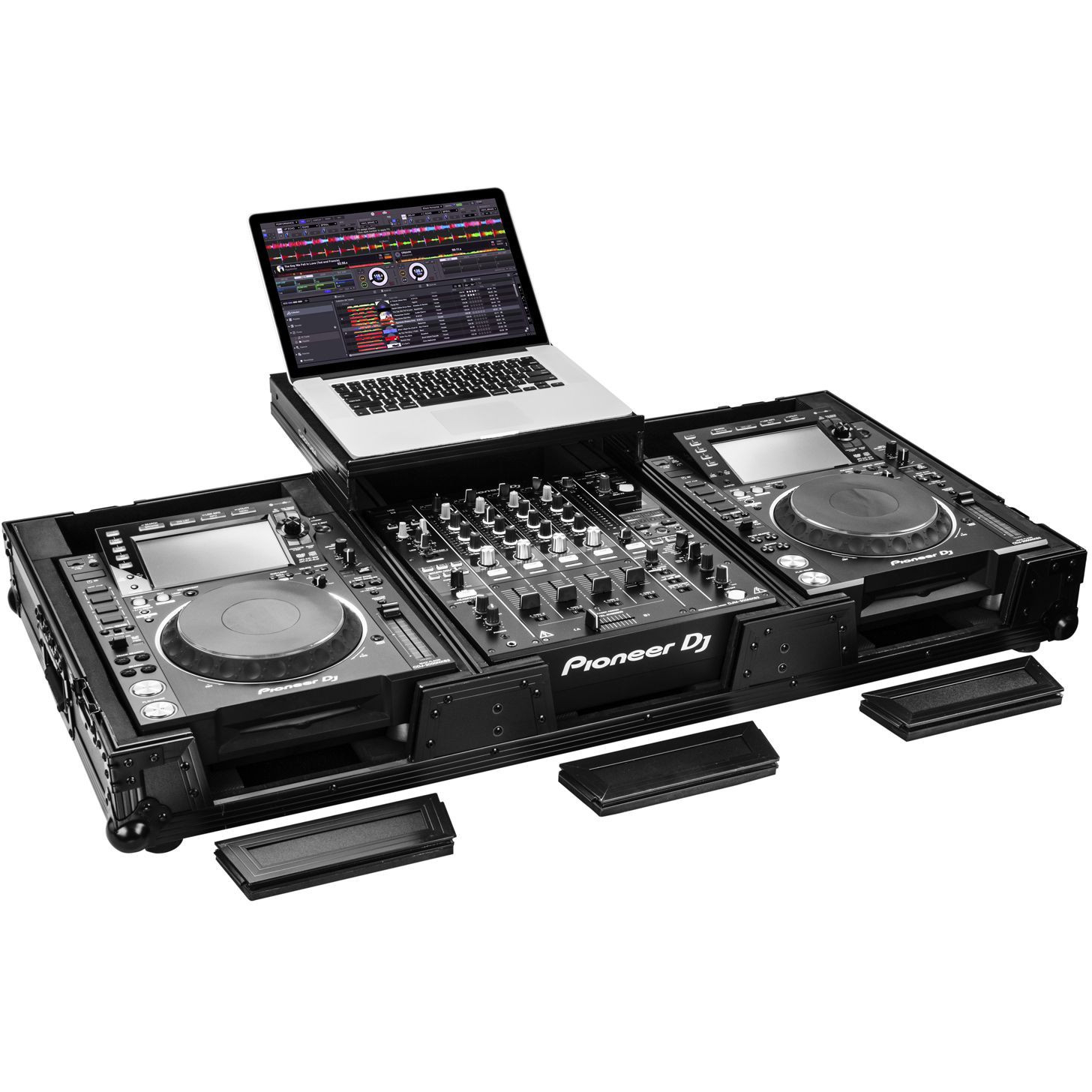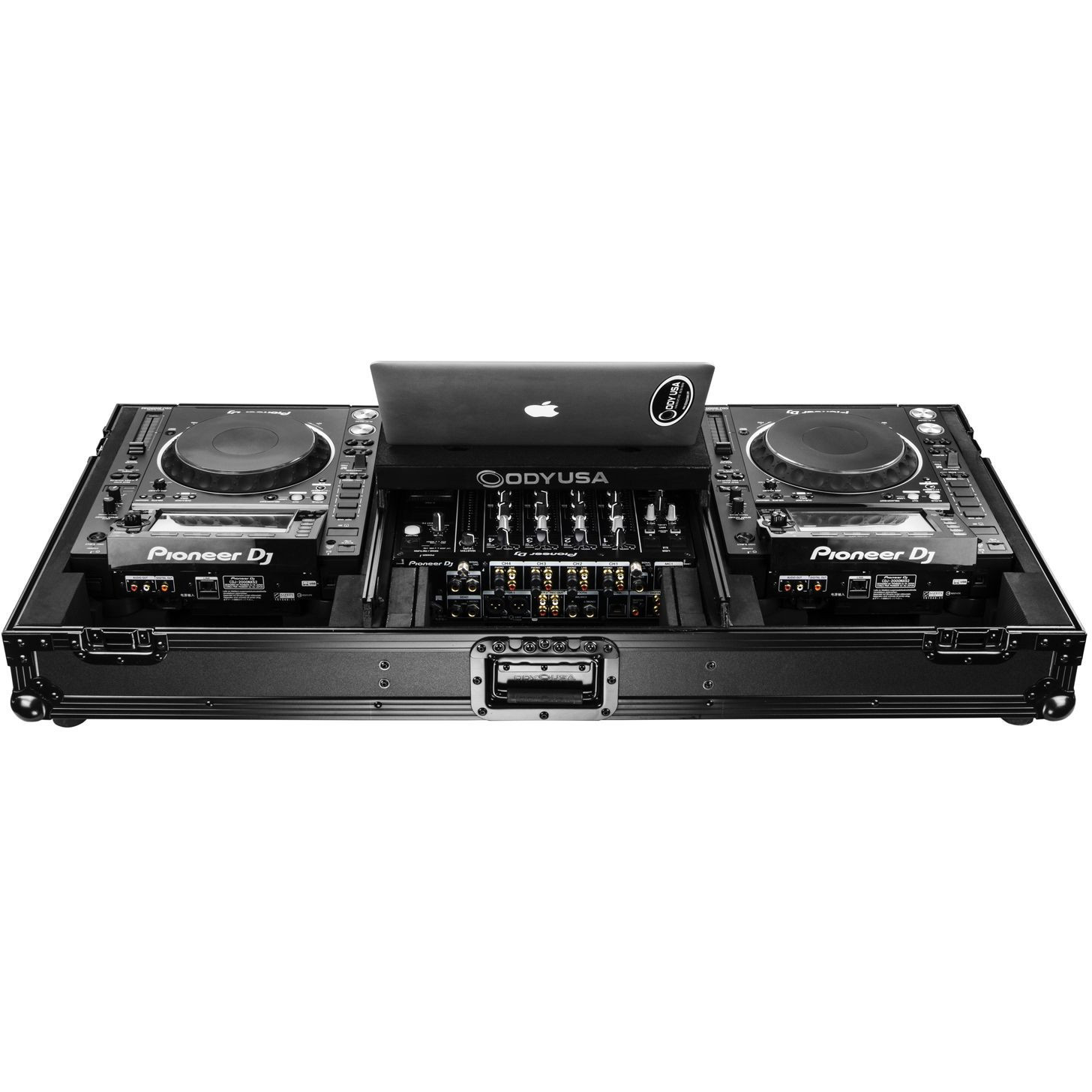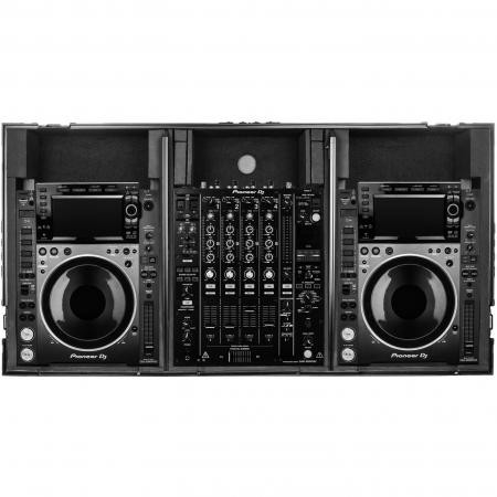 Odyssey Glide Style' CD/digital media coffins hold two large format tabletop CD/media players and one mixer. Each compartment features a bottom valley or pit that allows for more ventilation of the gear as well as an area for cable management or storage. Other features include rugged built-in wheels, spring-loaded latches, heavy-duty ball corners, and removable front access panels. Cabling is clean and easy through convenient access ports throughout.