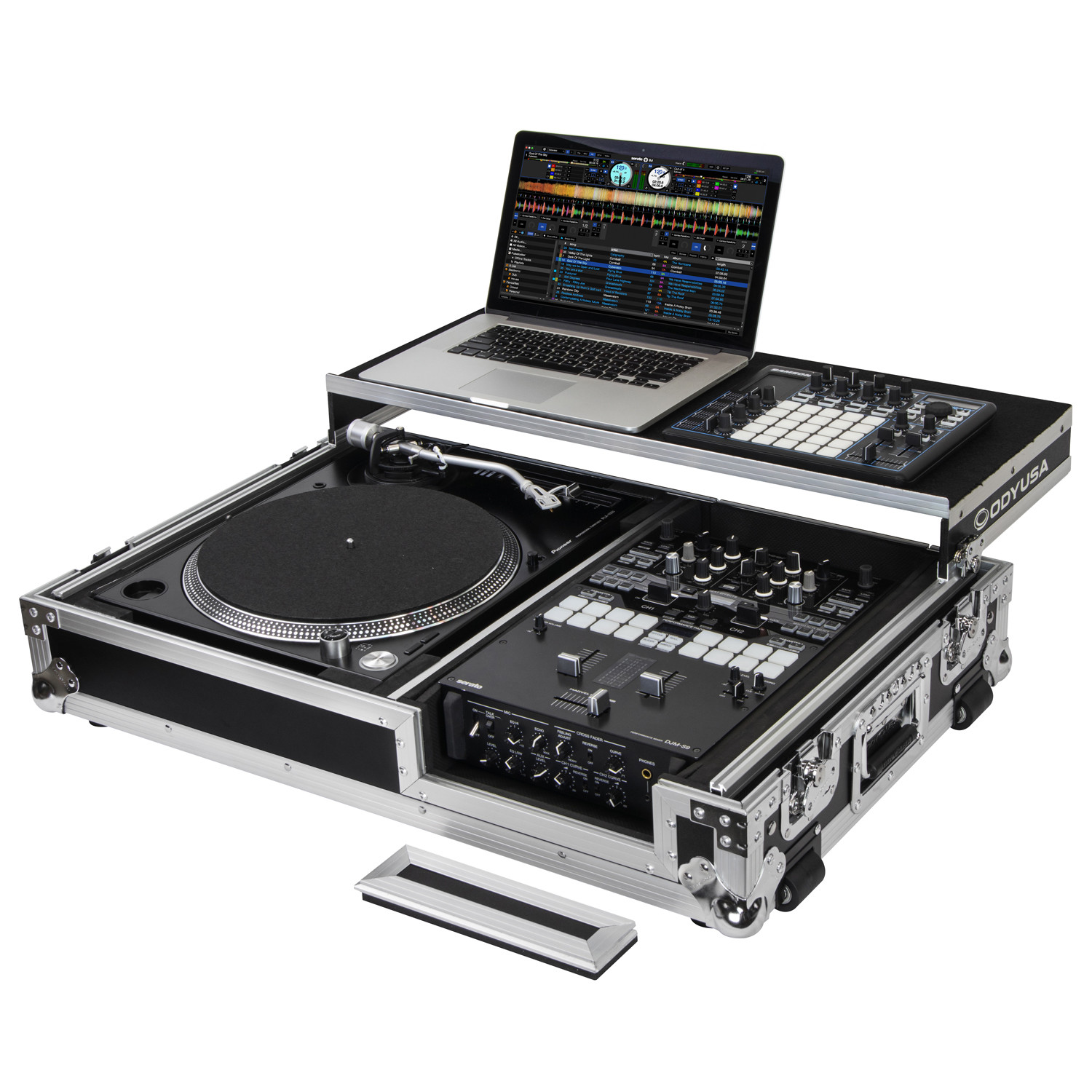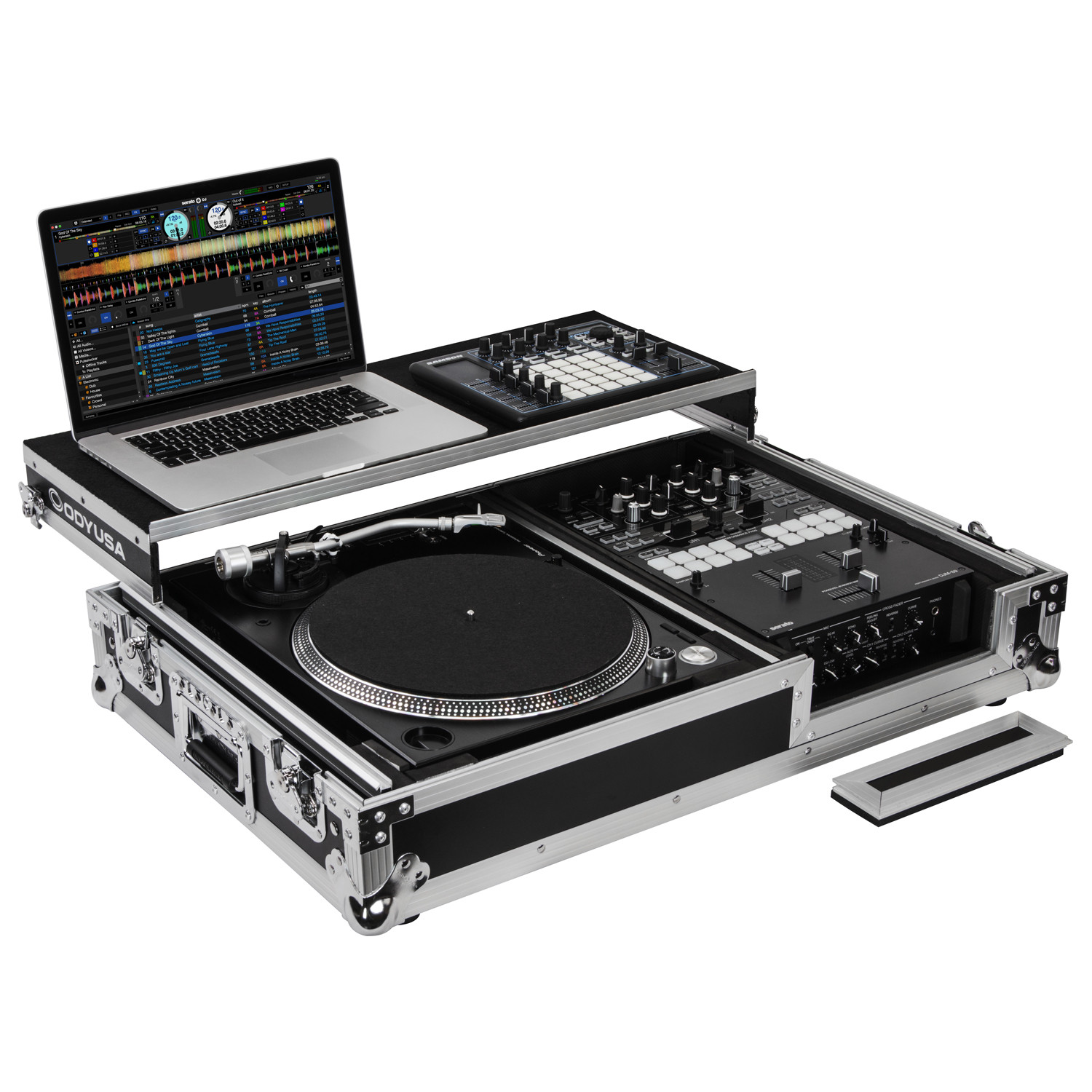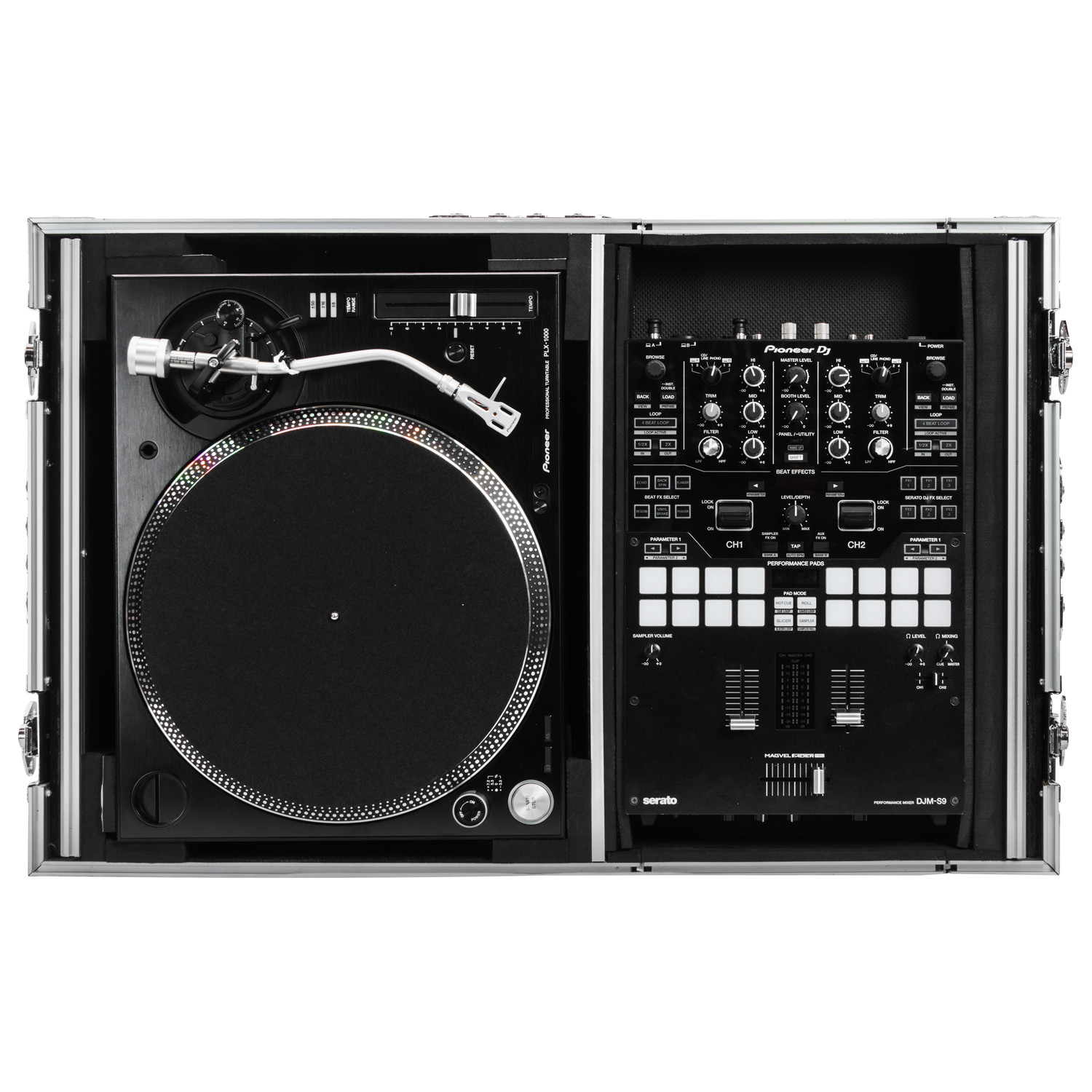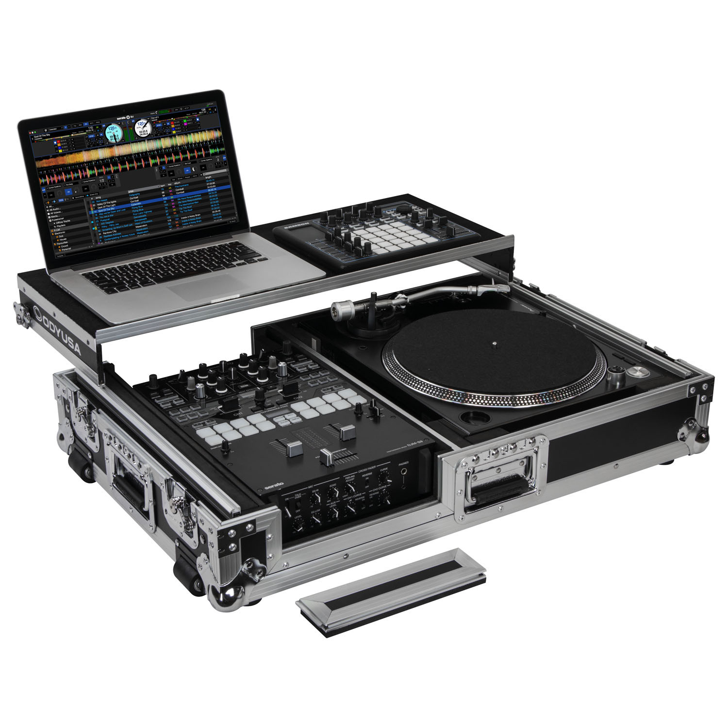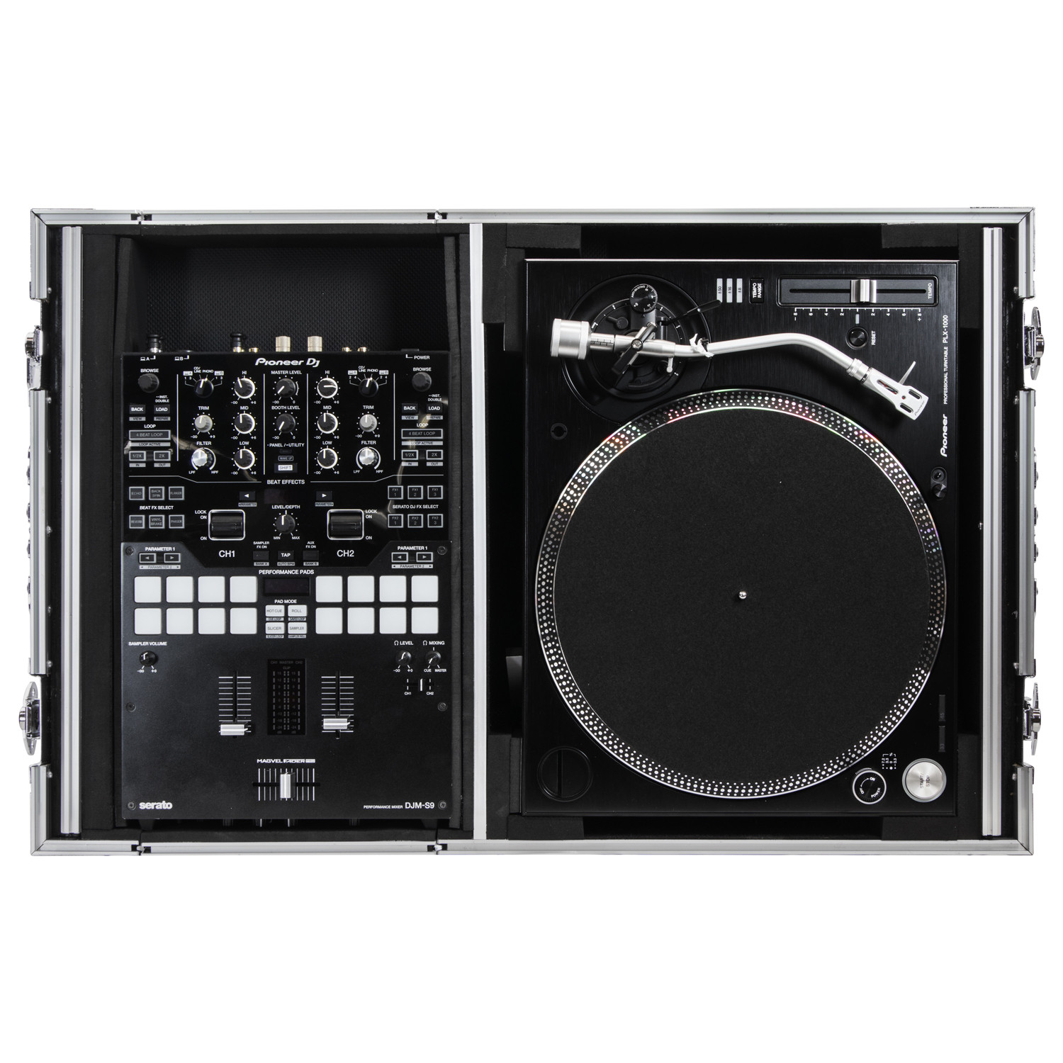 Other features include rugged built-in roller wheels, recessed latches and spring-loaded handles, heavy-duty ball corners, and front and read mixer section V-cut access panels. Cabling is clean and easy with convenient access ports throughout the case. Our turntable DJ coffins can accommodate Technics as well as Numark, Pioneer, Stanton, and similar sized turntables.