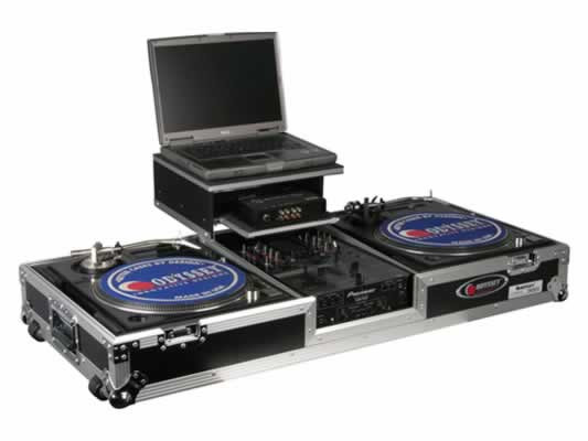 Our Glide Style Coffins hold two turntables in battle position, one mixer and a laptop. It has a convenient two tier platform specially designed for you to place a Serato or Traktor Scratch interface, hardrive, small processor and other DJ essentials as well as a laptop on top. Other features include rugged built-in wheels, heavy-duty spring loaded latches, stackable ball corners, and front access panels. Cabling is clean and easy through convenient access ports throughout. Can accommodate Technics as well as Numark and Stanton turntables.