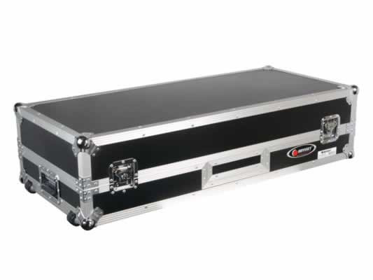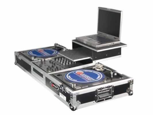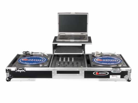 Odyssey's FZGSBM12W Glide Style Coffins hold two turntables in battle position, one mixer and a laptop. It has a convenient compartment specially designed to house a Serato interface built right into the gliding laptop platform.