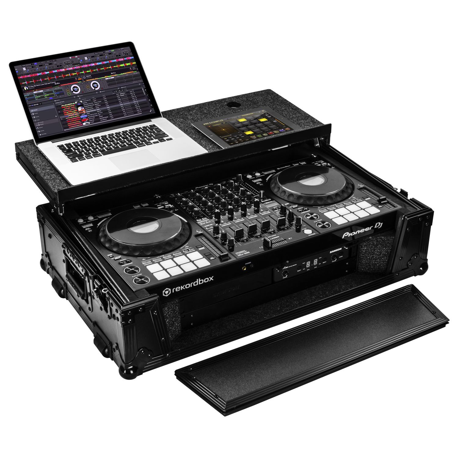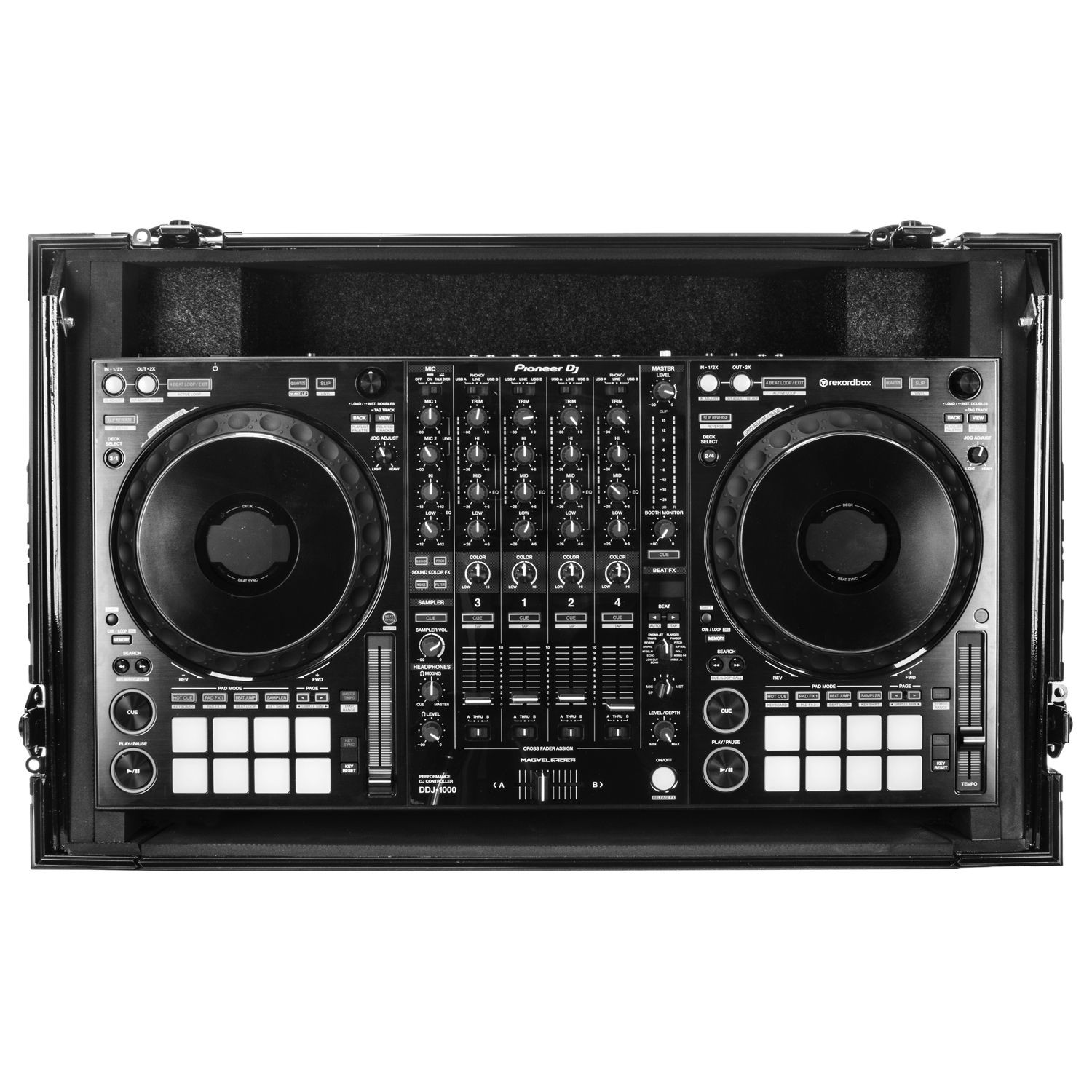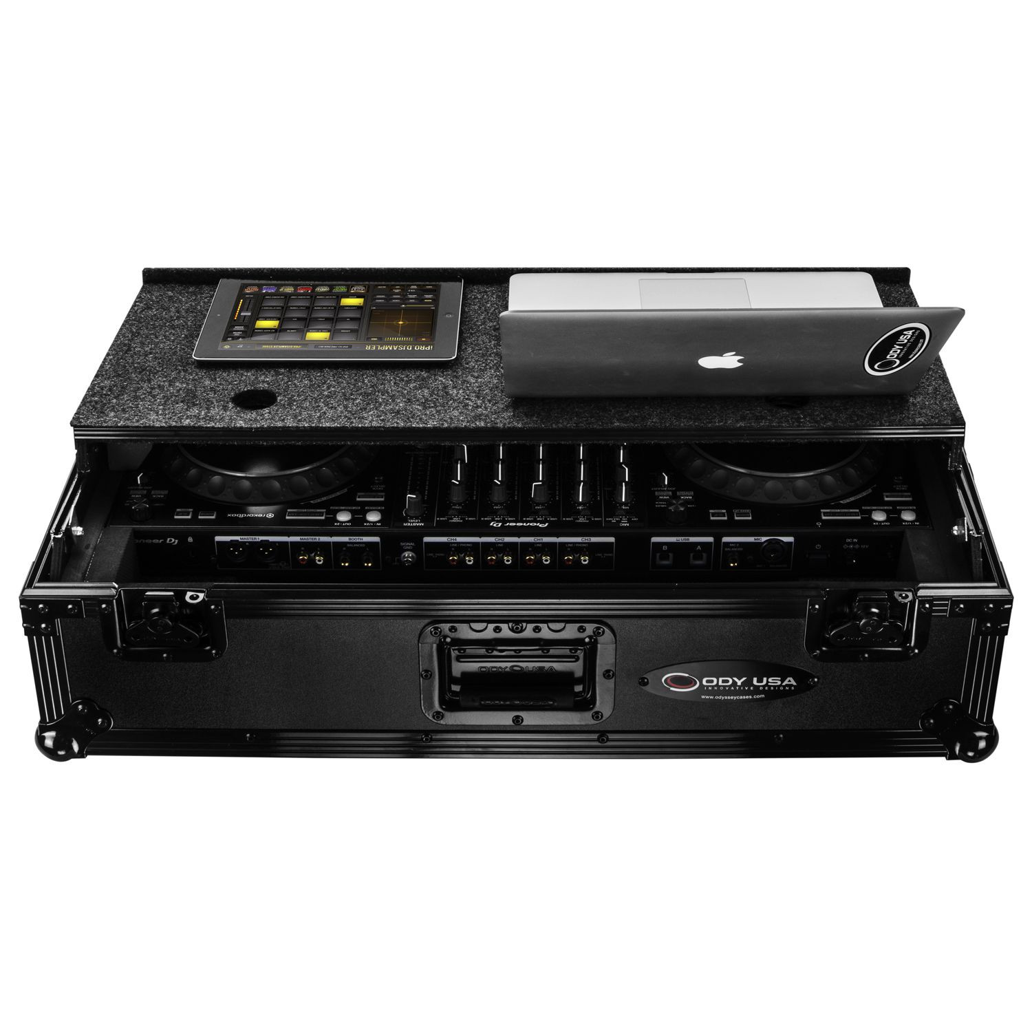 The Odyssey FZGSDDJ1000W2BL Black Label' case is specifically made for the Pioneer DDJ-1000 and DDJ-1000SRT controllers. The removable V-cut' front panel allows access to the front knob controls and input jack ports. The patented Glide Style' platform is perfect for positioning your laptop, tablet, effect processors, and other gear right where you want it over the controller. Features include bottom rubber feat, roller wheels for convenient transport, hefty ball corners, heavy-duty recessed latches and handles, and a rear cable management port, essential for a clean setup. Also underneath the controller compartment is another one of Odyssey's signature digital controller case designs; a preinstalled 2U 19" rack mount space perfect for rack mountable gear such a wireless mic system, power strip, drive rack, or storage drawer.