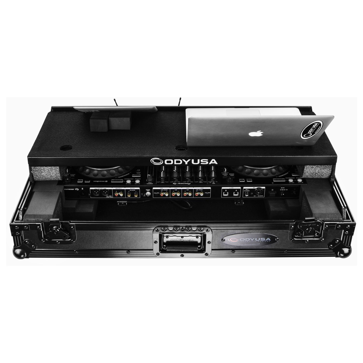 The Odyssey FZGSDDJ1000WGTB Black Label' case has an extra wide removable front panel allowing proper access to the all of the DJ controller's front knob controls and input jack ports. It features our patented Glide Style' platform perfect for positioning your laptop, tablet, effect processors, and other gear right where you want it over the Pioneer DDJ-1000 or DDJ-1000SRT controller. A cable management port, essential for a clean setup, is positioned below the rear of the player. Also Underneath the controller compartment is another one of Odyssey's signature digital controller case designs; an integrated convenient pullout tray shelf, perfect for placing your hard drive(s), headphones, smart phones, and other essentials out of sight while you show off your mix and tricks.
