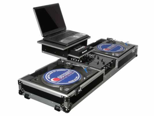 Odyssey Glide Style Coffins hold two turntables, one mixer and a laptop. The gliding laptop platform features a built-in pocket to house a Serato unit.
