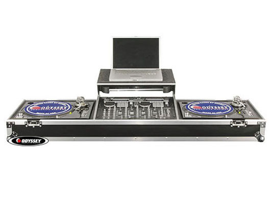 Our Glide Style' DJ coffins hold two turntables, one mixer, and feature our patented Laptop platform that glides forward and backward over the mixer. Other features include rugged built-in wheels, recessed latches and spring-loaded handles, and heavy-duty ball corners. Cabling is clean and easy through convenient access ports throughout. The FZGSDJ19R includes 1U of rack mountable space underneath the glide platform, great for a wireless mic system or other rack mount accessory.