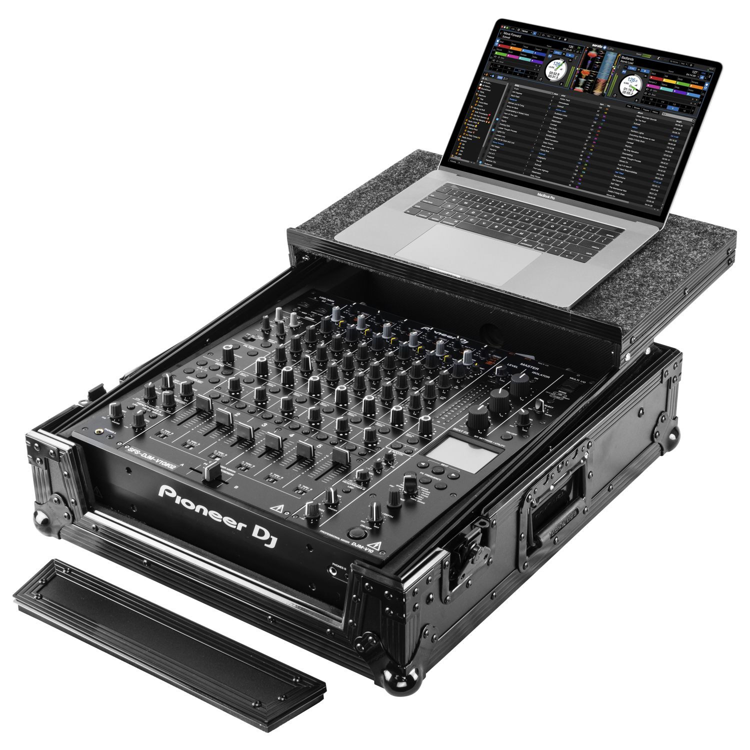 Specifically made for the Pioneer DJM-V10 6-channel professional DJ mixer, Odyssey's Flight Zone Glide Style' FZGS DJMV10 case in Black is built with our patented gliding laptop platform that conveniently slides forward or backward over the mixer to the desired position. The DJM-V10 sits perfectly safe inside the case with plenty of rear space essential for multiple player and laptop connectivity. The case also has a bottom storage pit that helps keep the mixer well ventilated as the dance floor heats up.