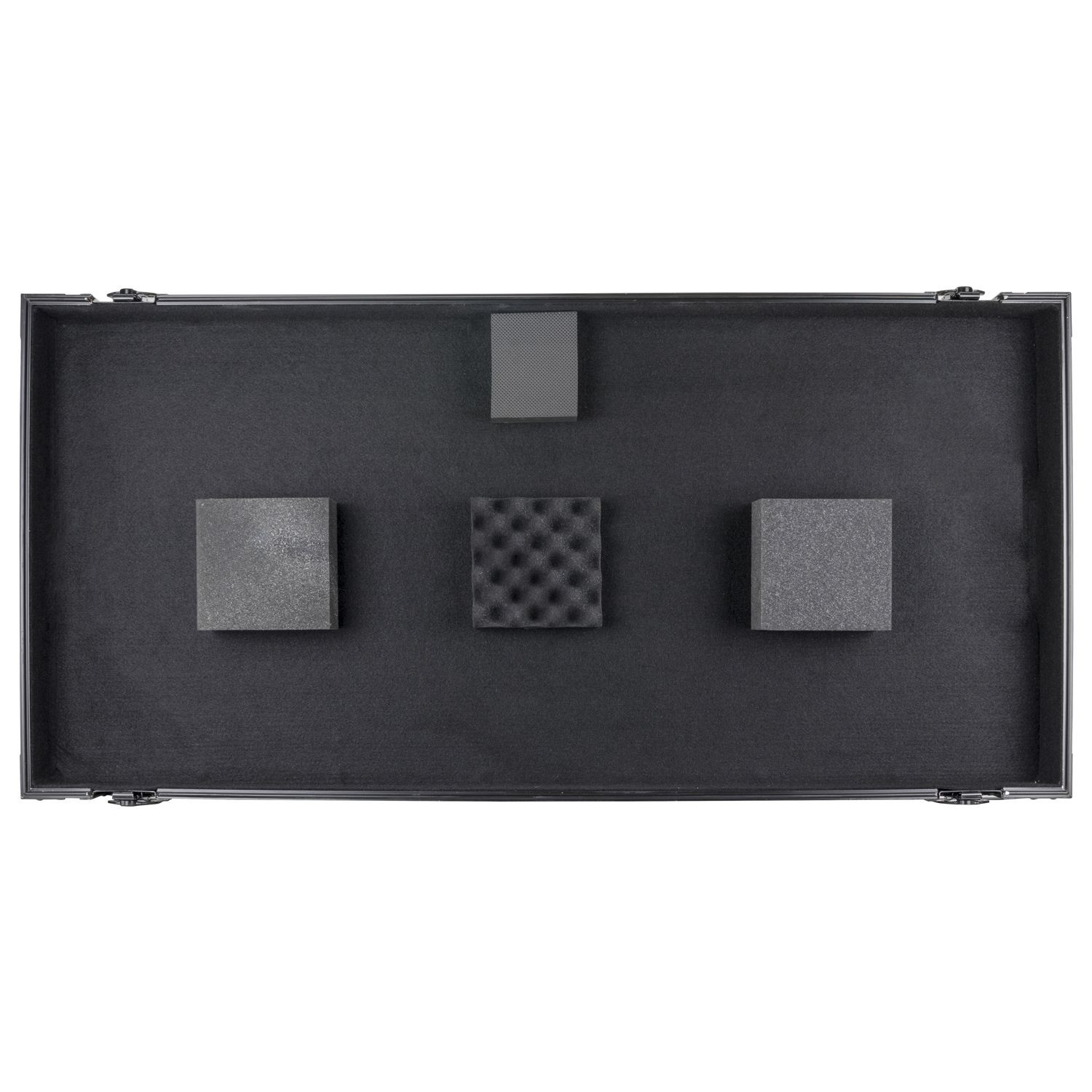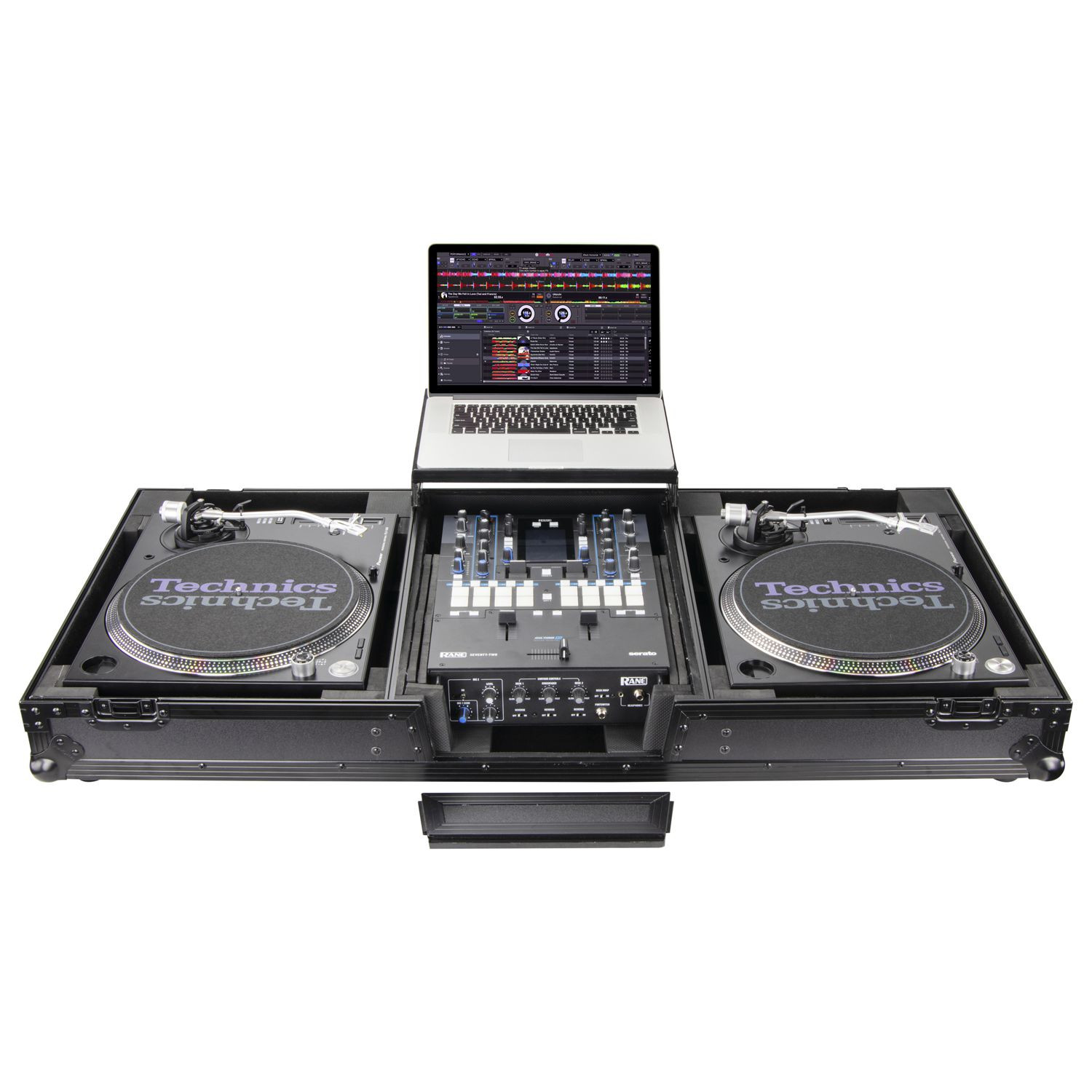 The FZGSLBM12WRBL Low Profile Glide Style' Coffin holds one 12" format mixer and two turntables in battle position. Features include rugged built-in corner wheels, sturdy 90 degree handles on the lid, recessed latches and spring-loaded handles, heavy-duty ball corners, and a front mixer section V-cut access panel. Cabling is clean and easy with convenient access ports throughout the rear of the case. Our turntable DJ coffins can accommodate Technics as well as Numark, Pioneer, Stanton, and similar sized turntables.