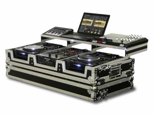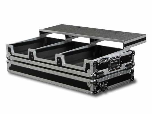 Our Glide Style' Coffins features our patented Laptop platforms that glide forward and backward over the mixer and players. This model holds two large format tabletop CD/digital media players, one 10" width mixer, and enough platform space for your laptop, interface, hard drive, midi controllers and other DJ Remixer essentials. Other features include player/mixer ventilation pits that can also be used as storage compartments, rugged built-in corner roller wheels, heavy-duty spring loaded latches, stacking ball corners, and removable V-Cut front access panels. Cabling is clean and easy through convenient access ports throughout.