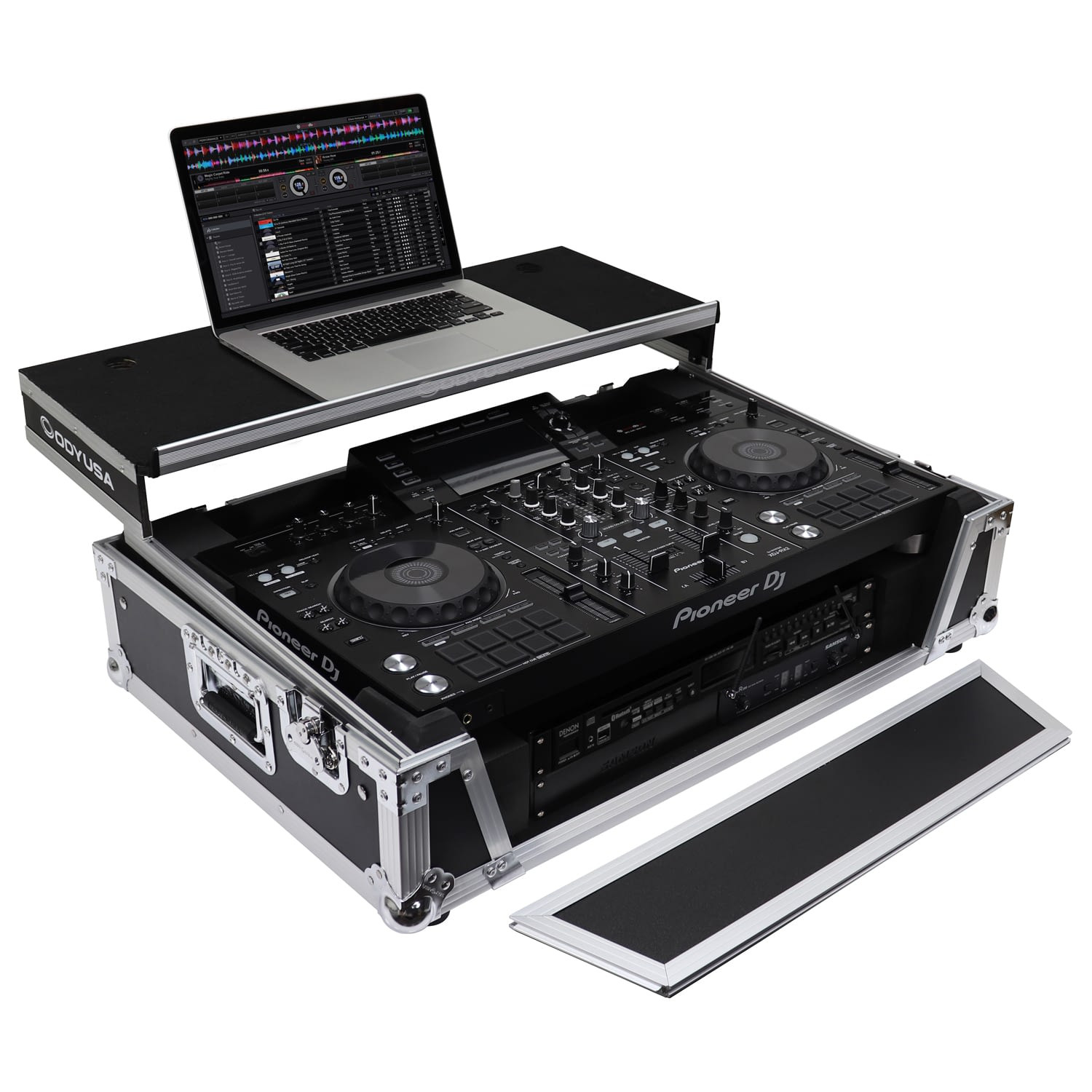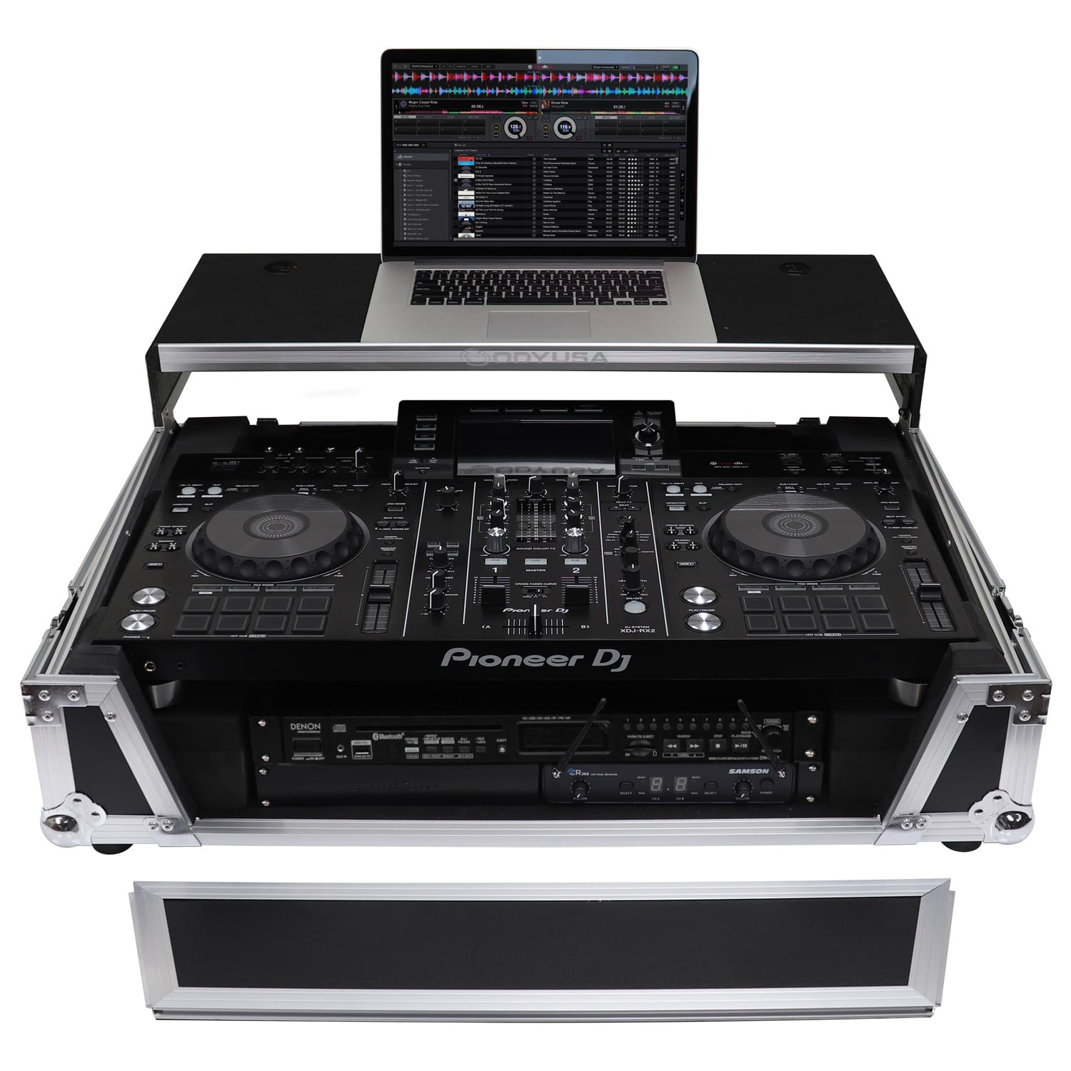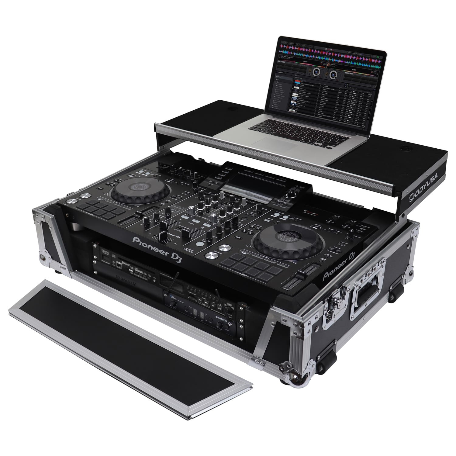 The Odyssey FZGSXDJRX2W2 Flight Zone case includes a removable V-cut' front panel allowing access to the all of the DJ controller's front knob controls and input jack ports. It features our patented Glide Style' platform perfect for positioning your laptop, tablet, effect processors, and other gear right where you want it over the Pioneer XDJ-RX or XDJ-RX2 controller. A cable management port, essential for a clean setup, is positioned below the rear of the player.