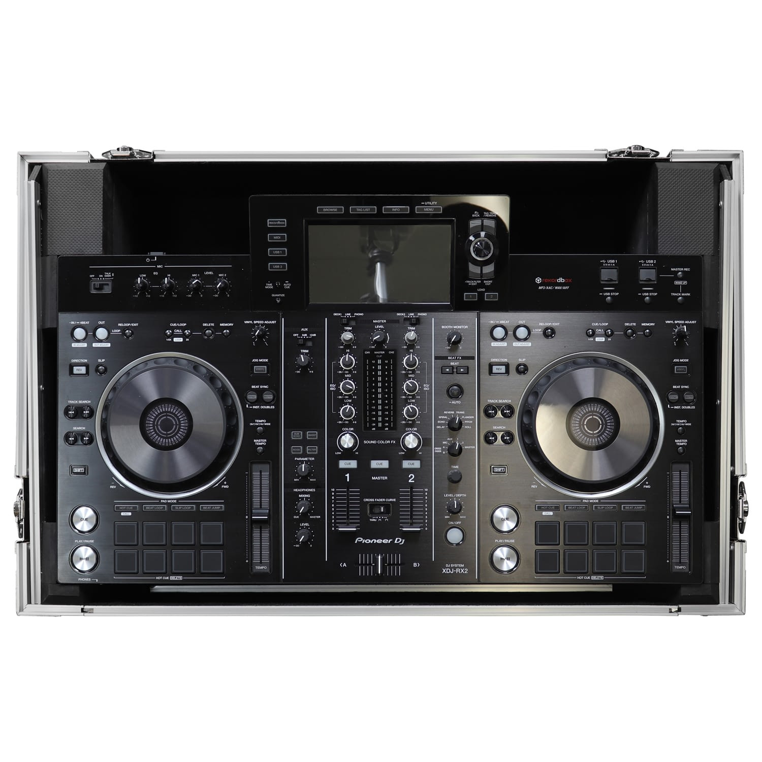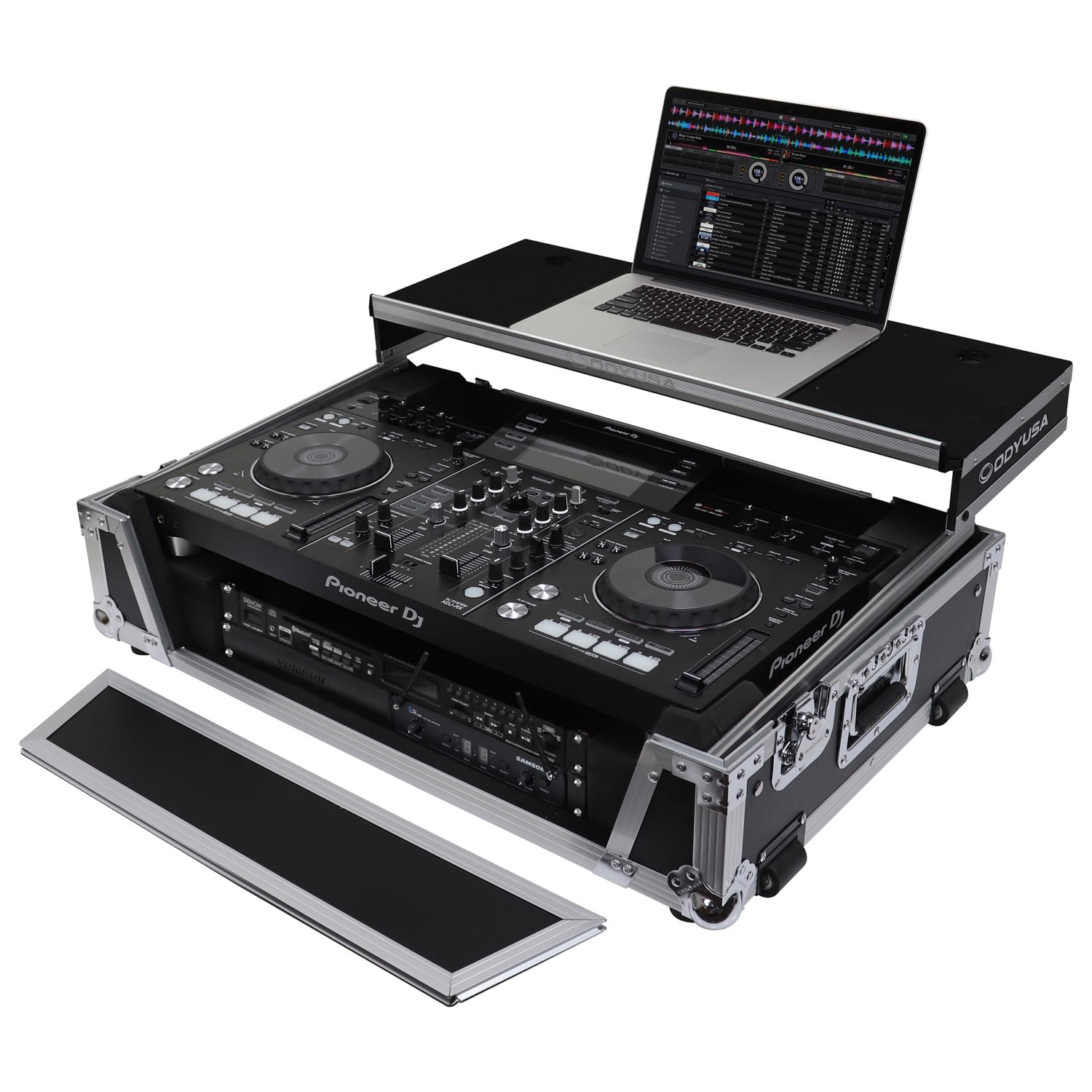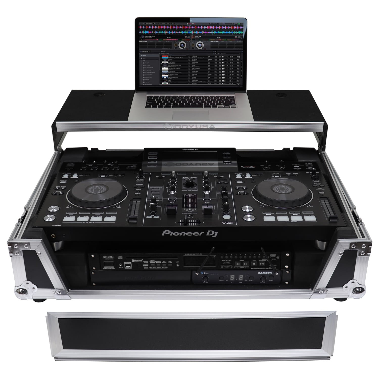The Odyssey FZGSXDJRX2W2 Flight Zone case includes a removable V-cut' front panel allowing access to the all of the DJ controller's front knob controls and input jack ports. It features our patented Glide Style' platform perfect for positioning your laptop, tablet, effect processors, and other gear right where you want it over the Pioneer XDJ-RX or XDJ-RX2 controller. A cable management port, essential for a clean setup, is positioned below the rear of the player.