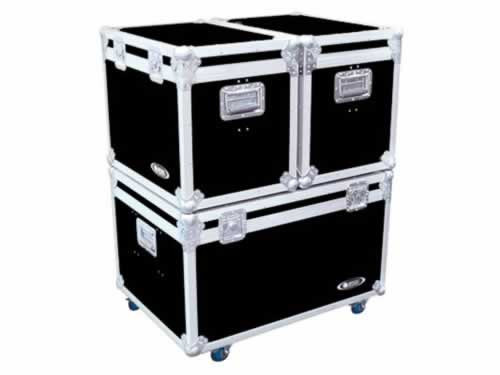 Fast and efficient use of space for easy load in and load out of venues. Internal removable partition included in each case for quick storage and arrangement of all your stage and lighting gear. The base unit of this 3 piece system has 4 inch casters, two of which have brakes. Designed for truck bed widths of 90 in. Recessed hardware, spring loaded handles and fully removable covers.