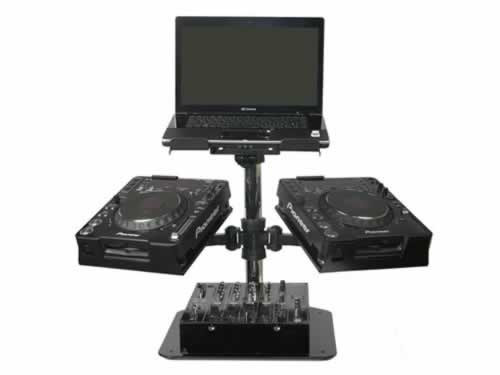 The L2CDJUNI version has two LCDJPLATE's to hold a two Pioneer CDJ-1000 players and one L-Evation Universal plate (LUNIPLATE) with adjustable depth support for your laptops, most other tabletop CD players, effects units, and other pro gear. Easy to assemble and customize with its adjustable height and strong robotic-like support arm. Have it set-up over your turntable, mixer, and other gears, giving you that extra cutting edge in your mixes with easy access to your mounted gear.