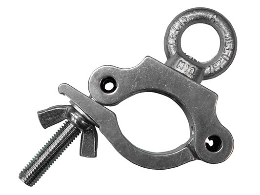 The Odyssey LACPE30 lighting pro narrow clamp with eye bolt has a working load limit of 661 lbs. It features a 1.18" thick aluminum body construction and is compatible with up to 2" diameter tubes.