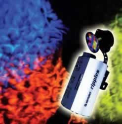 A water effect gets reflected off of a multicolored moon dish, which spins the rippled beams around the dance floor. Sound active.