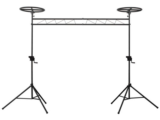 • Breaks Down into 6 Pieces: Two Aluminum/Steel Crank-Up Tripods, Two 5' Long Truss I-beams, and Two 30" Diameter Adjustable Halo Attachments.
