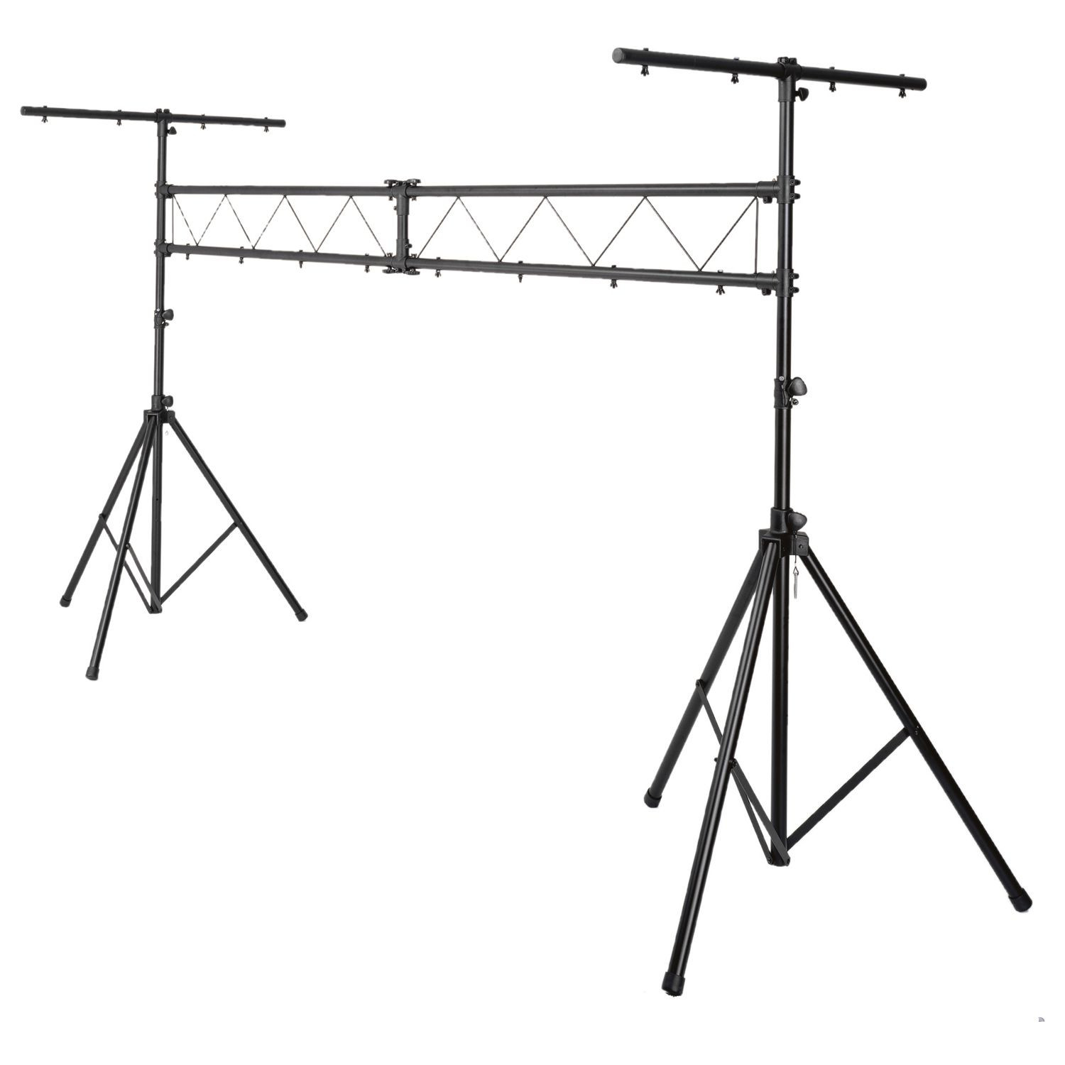 • 2 black aluminum tripods which extends to 9ft, 2-5 foot truss I beams when connected have a 10 foot span and 2 T-bars.