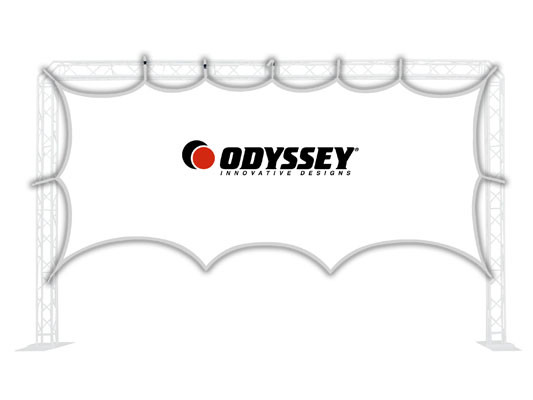 Designed for large indoor and outdoor venue applications, the ODYSSEY SCRIM WERKS' LTMVSCRNLG fully stretched has a 16-ft x 6.5-ft maximum viewing field area for video projection and 16 sewn in stretch loop points to stretch and secure into various shapes and sizes. The LTMVSCRNLG can also be used for a variety of other application from unique outdoor shading attached onto truss or other temporary structures to indoor theatrical or banquet backdrops with colored lighting effects.