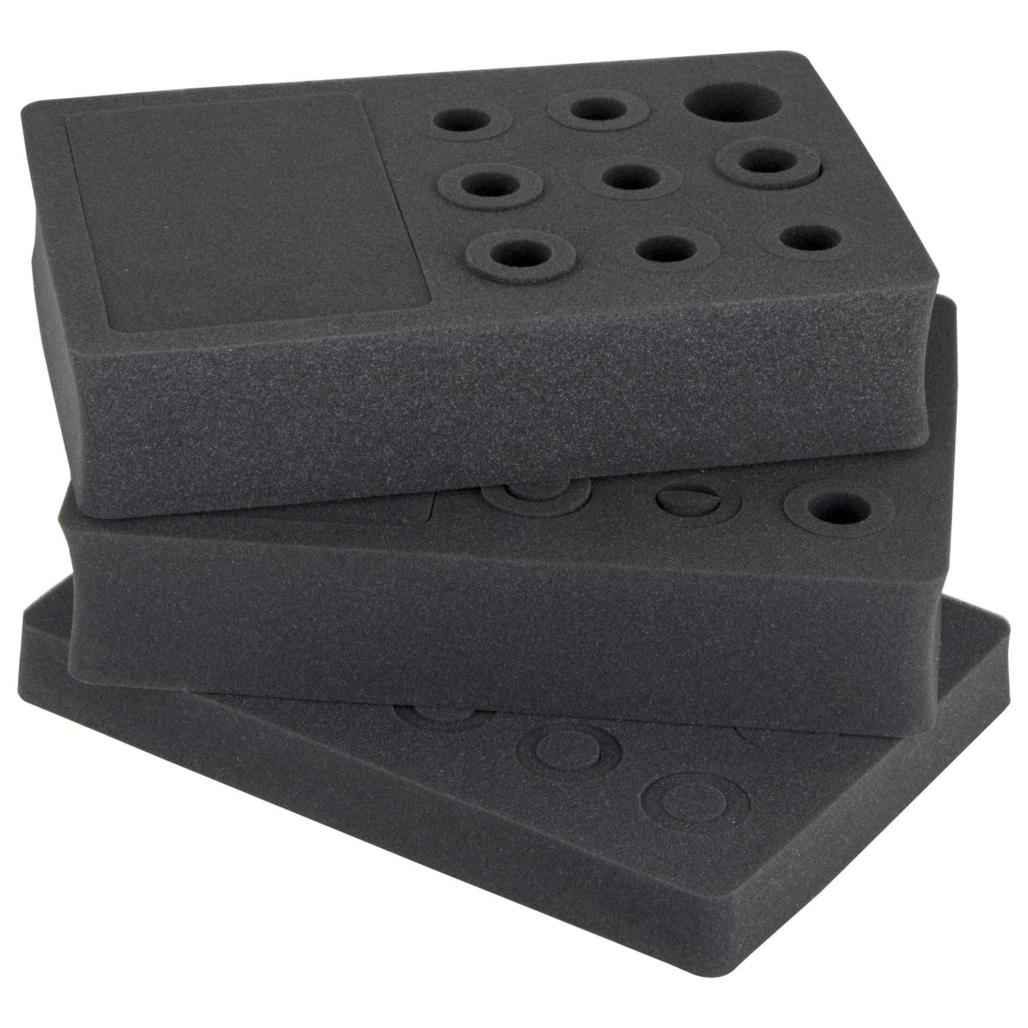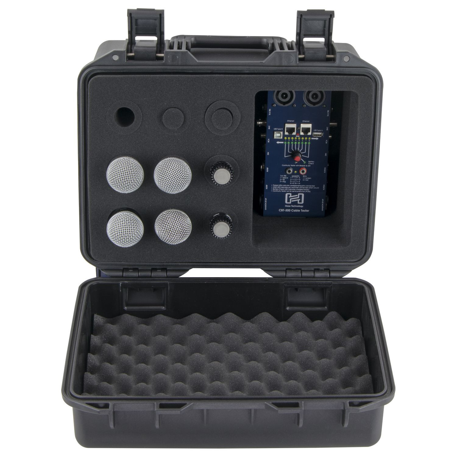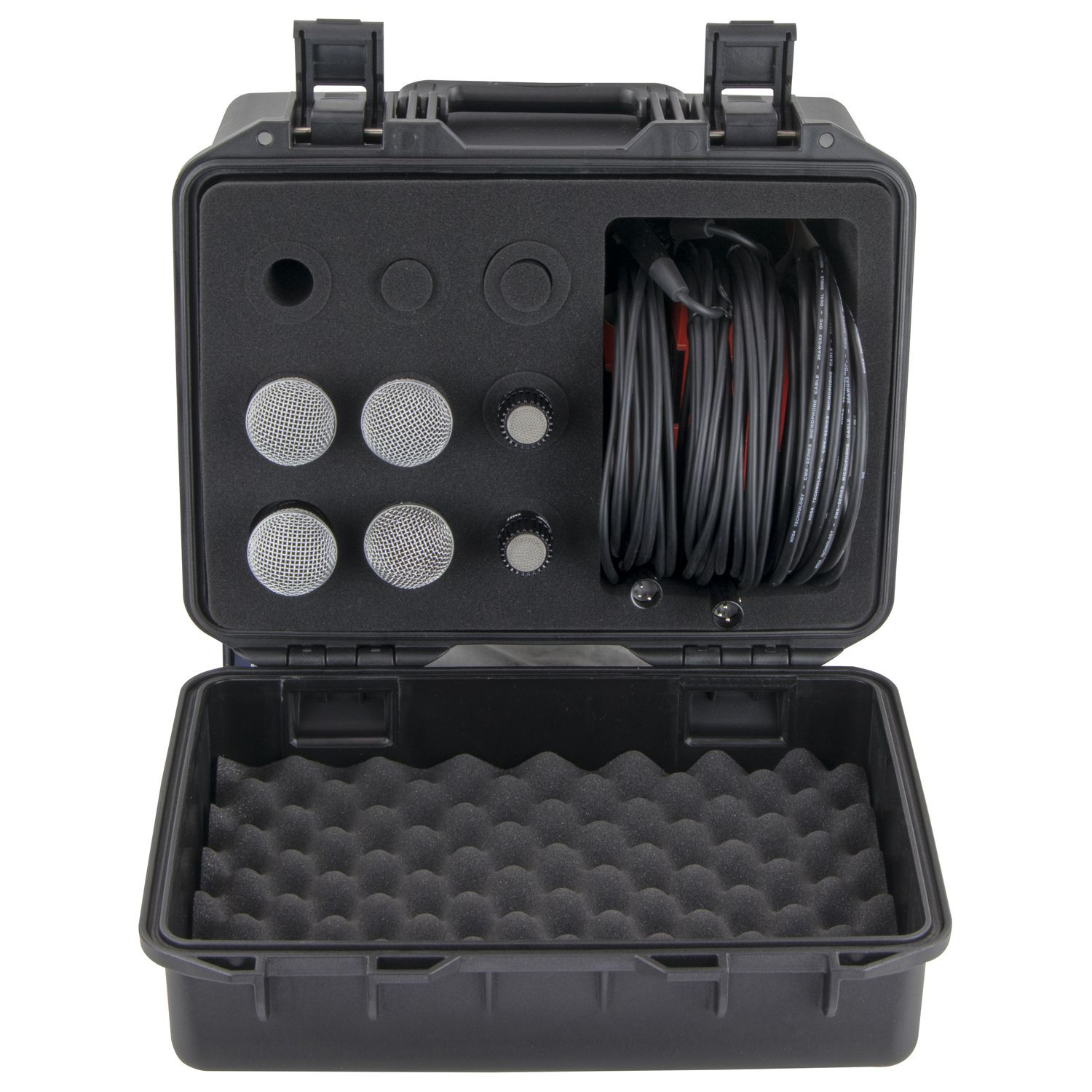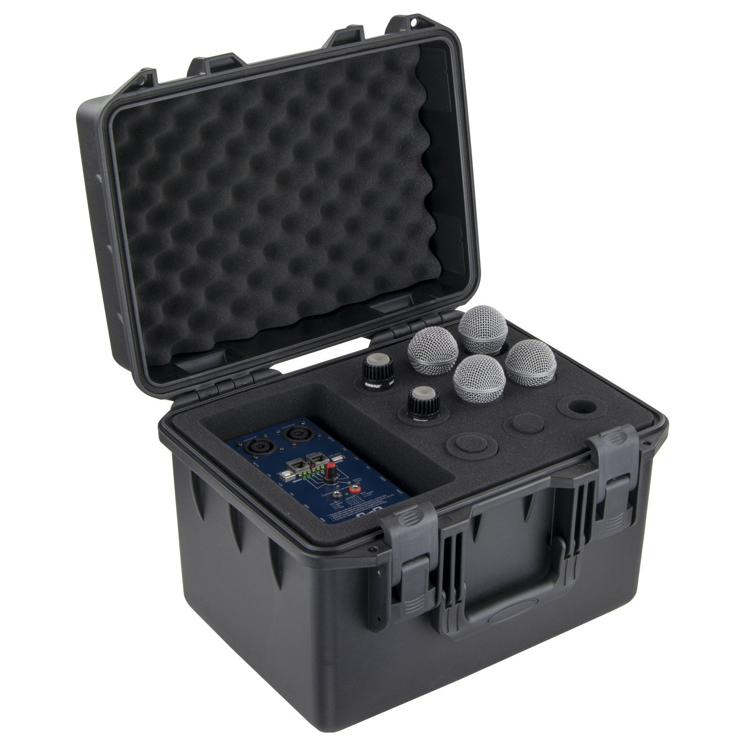 Our Vulcan series cases are watertight, dust-proof and impact resistant. Each are injection molded of a high strength polymer resin which provide you with the ultimate in protection for your gear. The VUMIC09 Vulcan series microphone cases feature a full foam interior and holds up to 9 handheld microphones. Other features includes an interior dedicated accessories compartment section, a comfortable carrying handle, and two padlock holes.