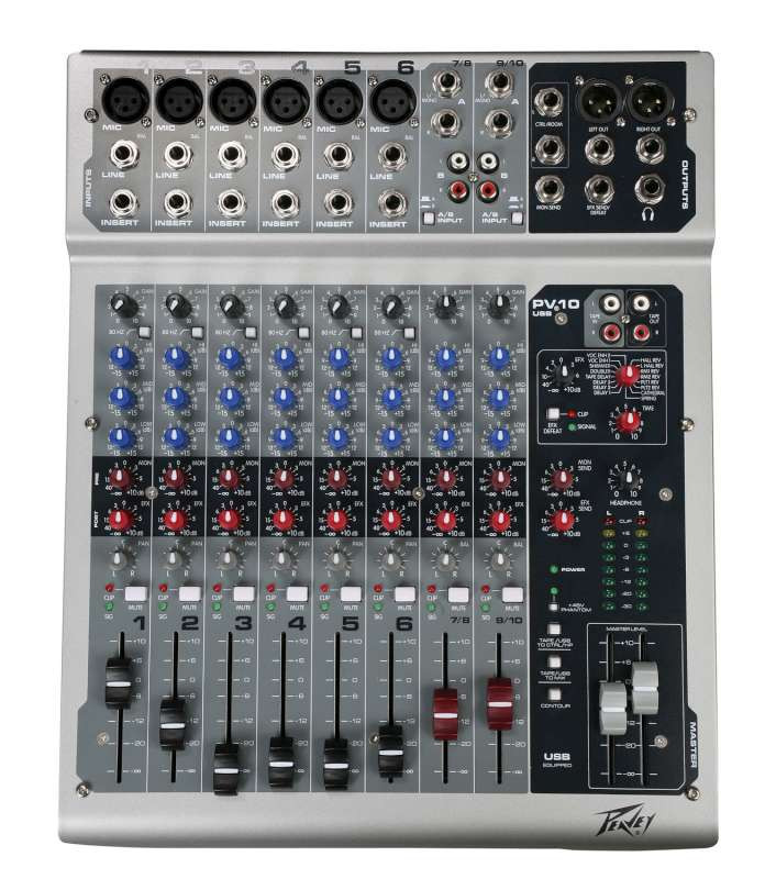 The PV 10 USB features built-in DSP effects with multiple reverbs and delays, plus vocal enhancer and much more, while a USB port allows direct connection to a USB-equipped computer for recording from the mixer or playing back digital audio (compatible with Mac OSX, Windows XP, ME & 2000). It also includes pre-fader monitor sends; post-fader effects send; inserts on all channels; and dual, switchable line inputs on the two stereo channels.
