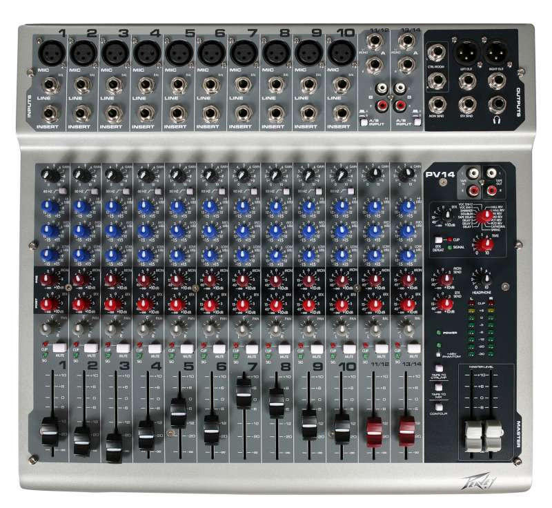 The PV 14 compact mixer has the best features, quality and price of any mixer in its class. Peavey's reference-quality mic preamps spec in at an incredible .0007 THD making the PV14 mixer excellent for live or recording applications.