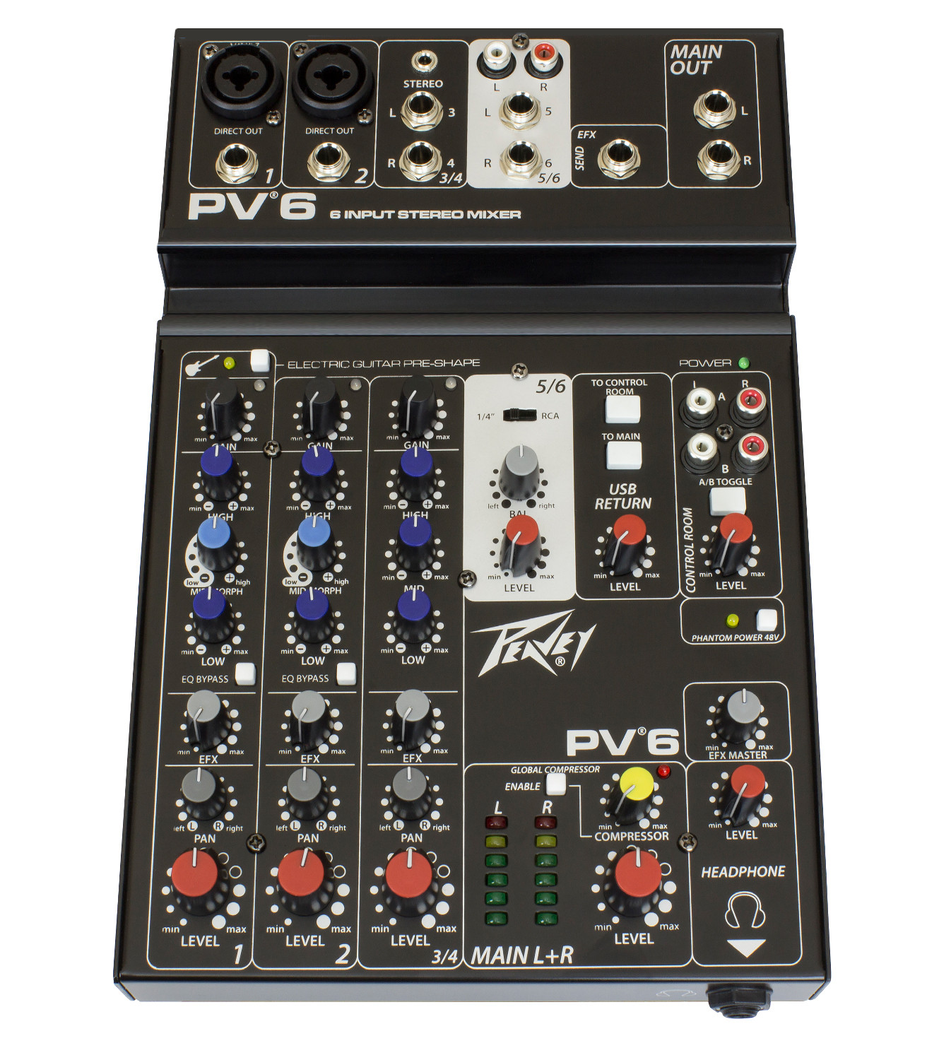 Equipped with Peavey's reference-quality mic preamps that spec in at an incredible 0.0007% THD, the PV 6 mixer is excellent for live or recording applications. The PV 6 includes 2 channels of reference-quality mic preamps, 2 direct outputs for recording, a stereo input channel, a dedicated media channel, and an effects send jack with level control.