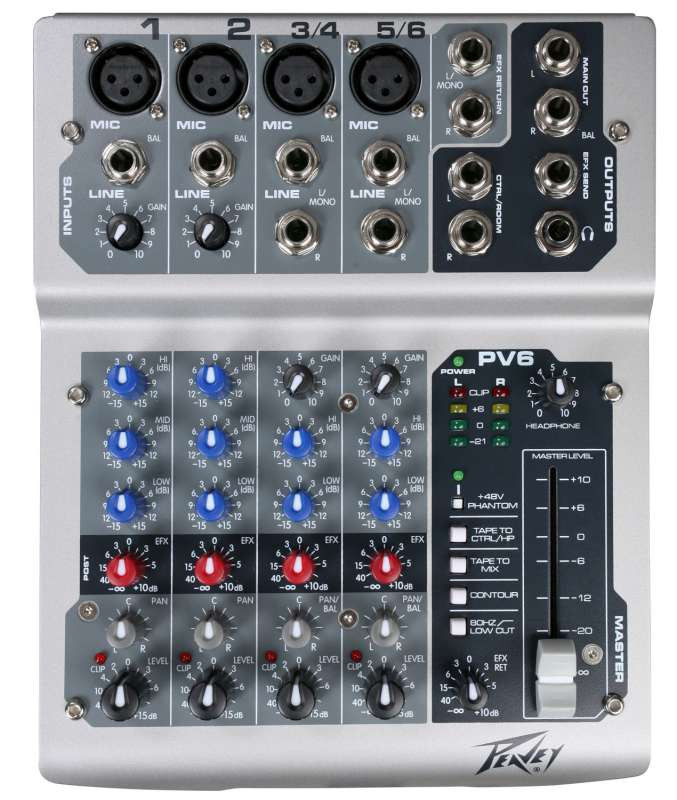The PV6 compact Peavey mixer offers durable construction and excellent sound quality at an unbelievably low price. Made of metal, not plastic, the PV6 is built tough and designed for either live sound or recording. Its reference quality mic pre-amps are super quiet with less than 0.0007% of total harmonic distortion. Each of the four channels includes XLR and 1/4" inputs, phantom power, EQ and effects send. The master section offers assignable tape input and a master contour EQ which simultaneously cuts mids while slightly boosting the bass and treble in the overall mix. Outputs include L & R for main and control room, effects send and headphones.