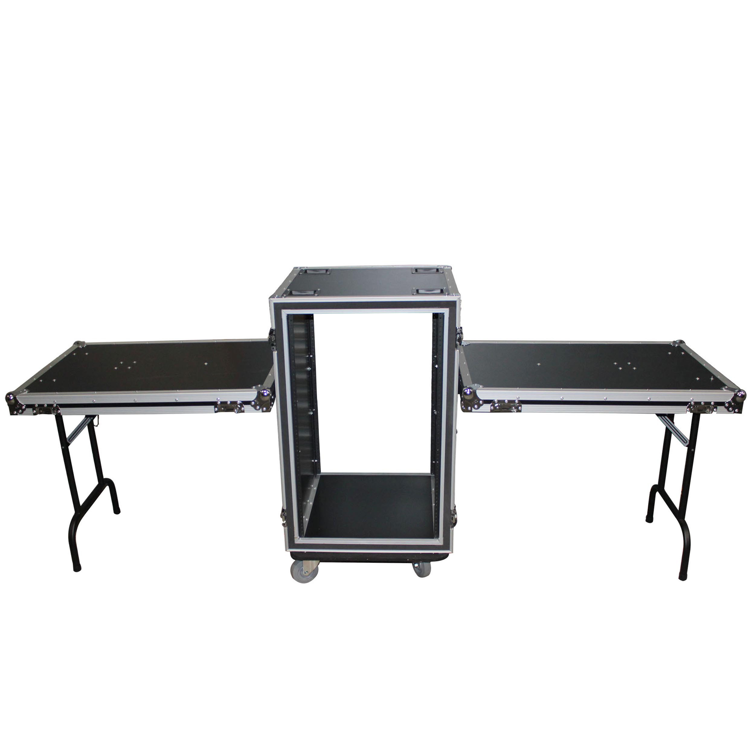 The ProX T-18RSP24WDST 18U Space, 24" Rail to Rail Depth, Vertical, Shockproof amplifier rack case with 2 side tables, is the perfect storage solution for durable security for a wide variety of amplifiers, Pro DJ mixers, effects, and any other standard 19" width rack-mountable Pro Audio/DJ/Network gear.