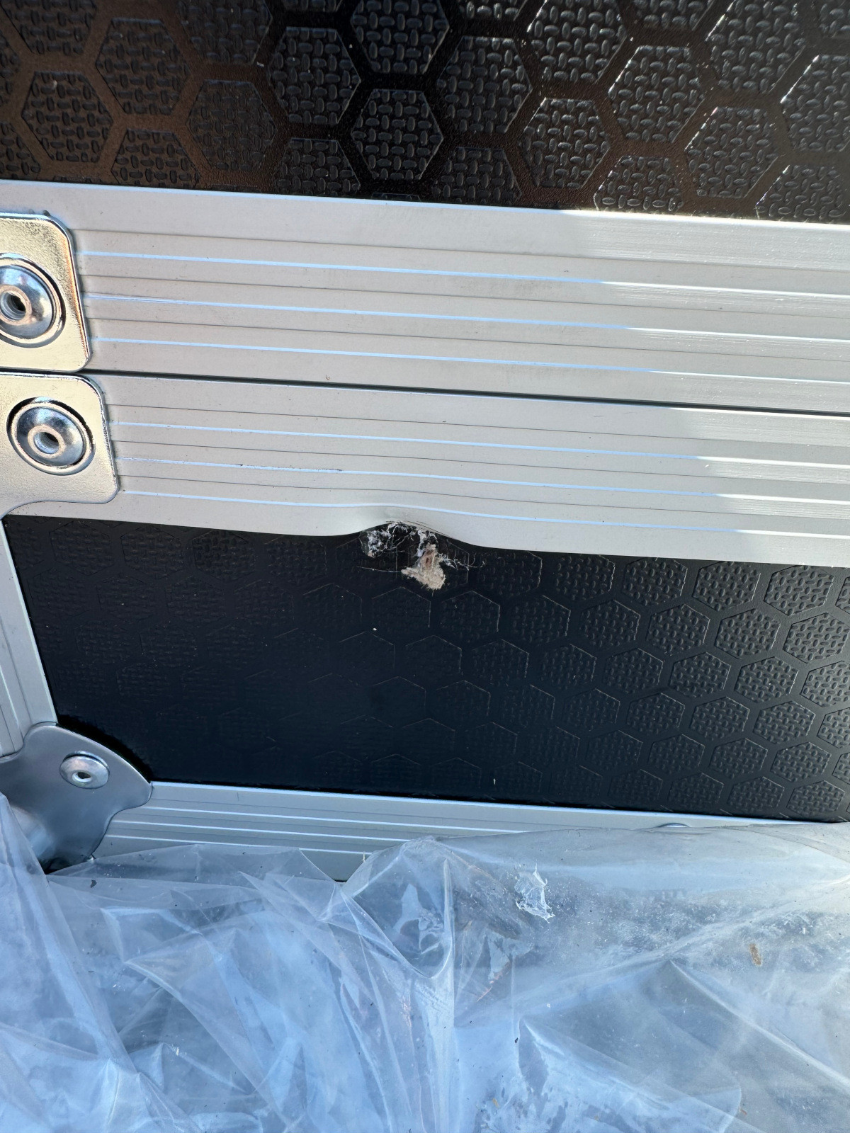 Overall, a great looking case. But there are some damages worth noting. The rear of the case has a small puncture. The gliding tray has a dent in the rear near the stop mechanism. And the carpeting at the rear corners of the gliding tray has been scraped back a bit. (See images.) Other than the cosmetic flaws, a fully functional and structurally sound case. Rated 8 / 10.