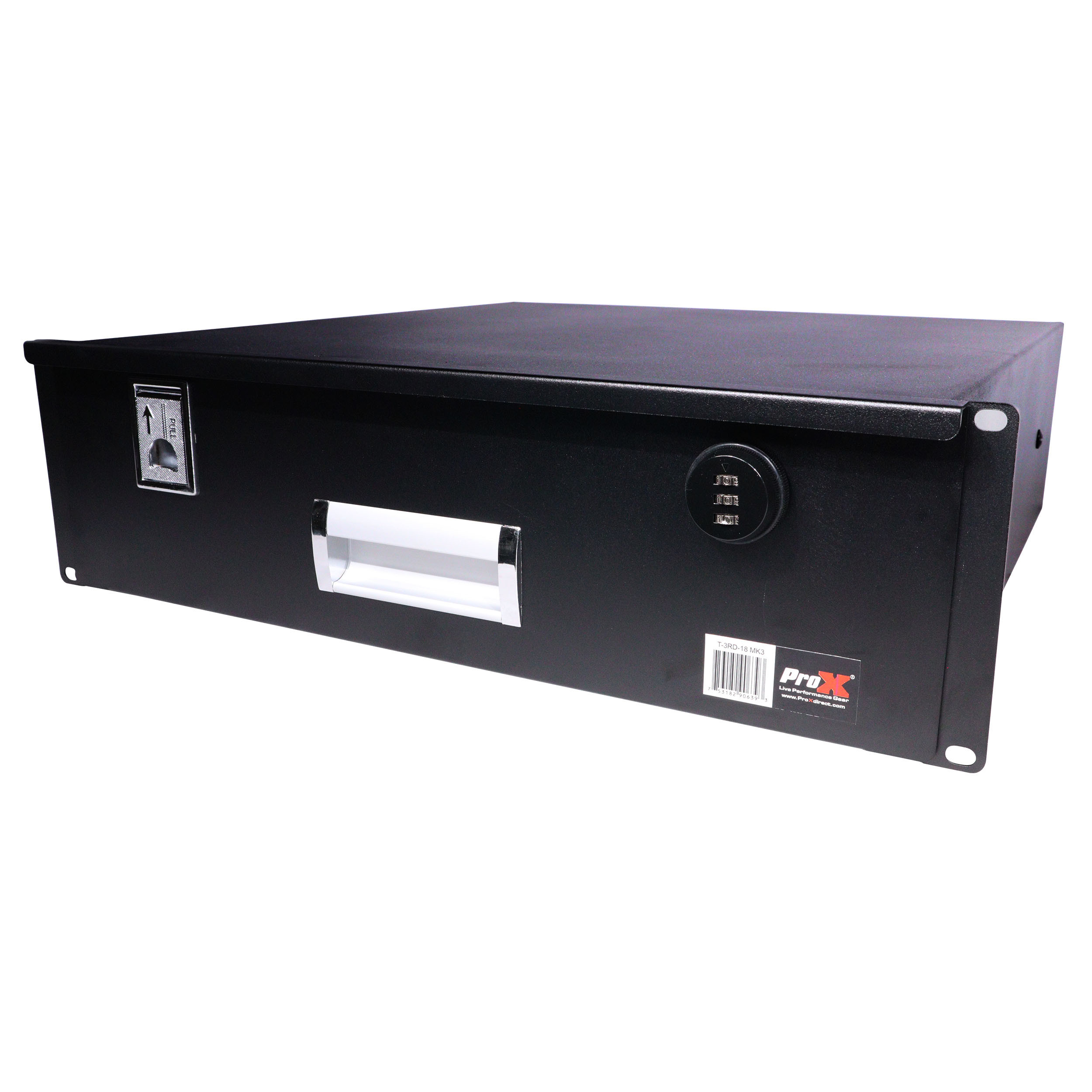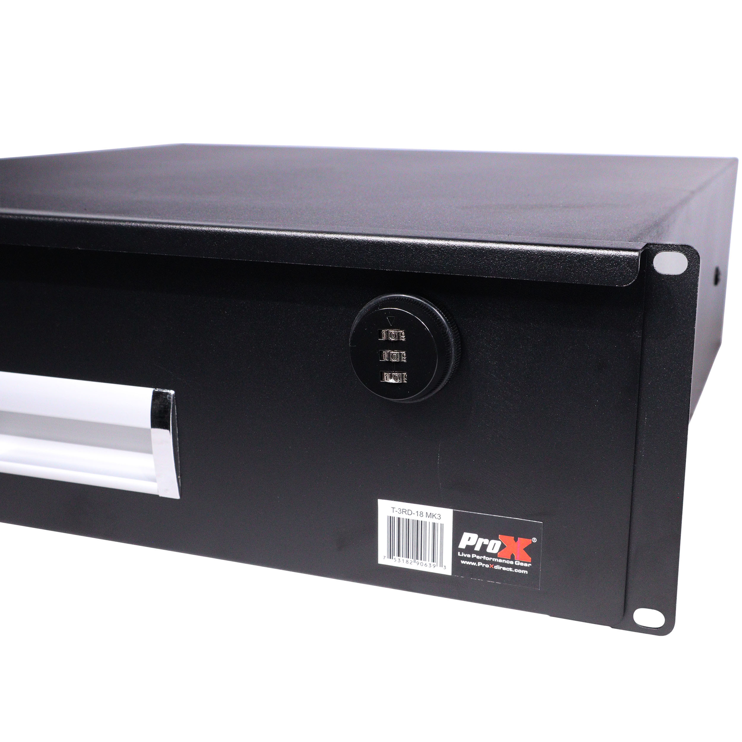 ProXT-3RD-18 MK3 This rack-mountable sliding drawer can be mounted to any Standard 18-inch Rack Case or Cabinet. These high-quality steel drawers are electro-static protected. It has a sleek powder-coated finish,it comes in a variety of options including 2U, 3U, and 4U. Each rack drawer slides out smoothly and can be locked. It has a programmable 3-digit key combination lock (with included reset key see included instructions). Also available for standard 12-inch rack cases and cabinets.