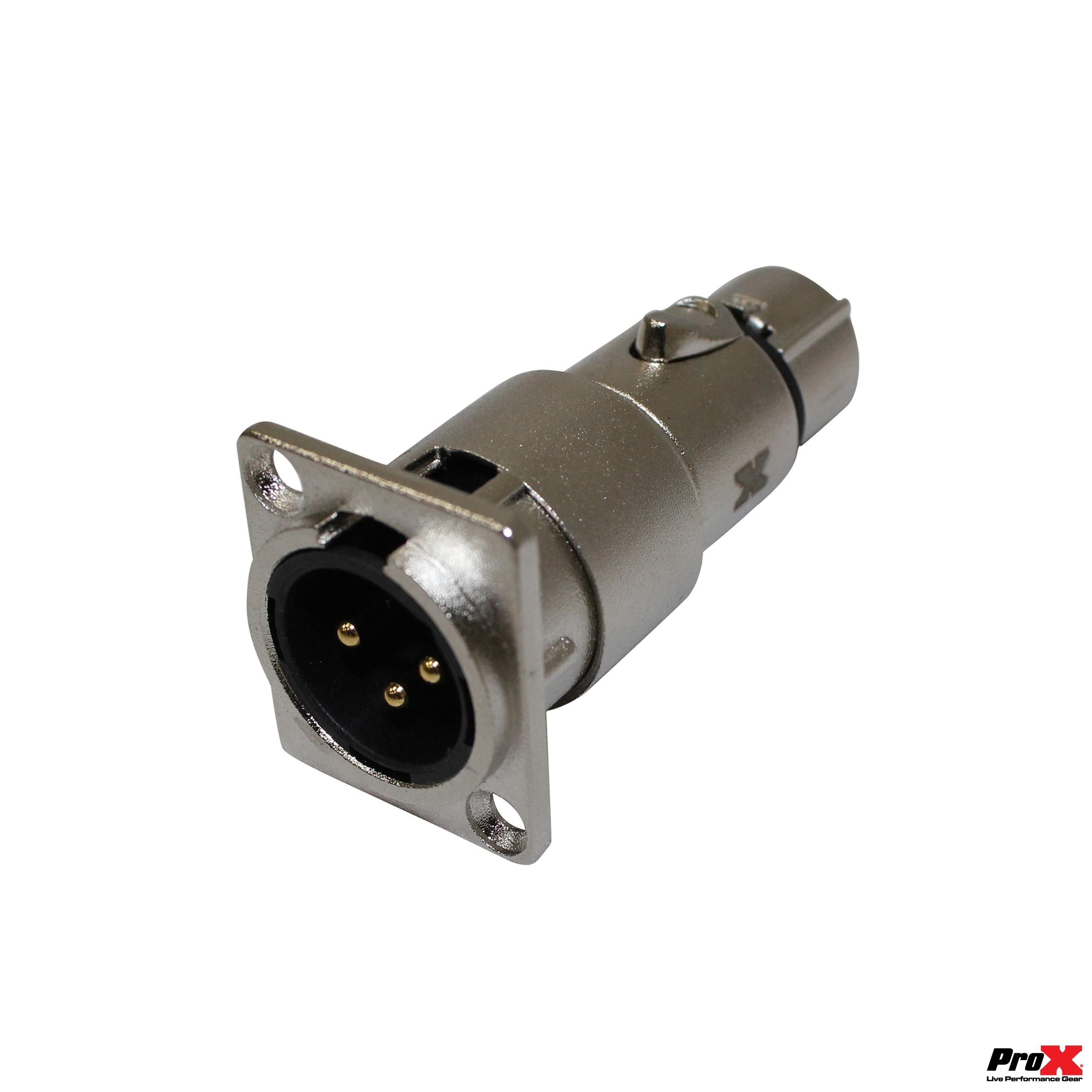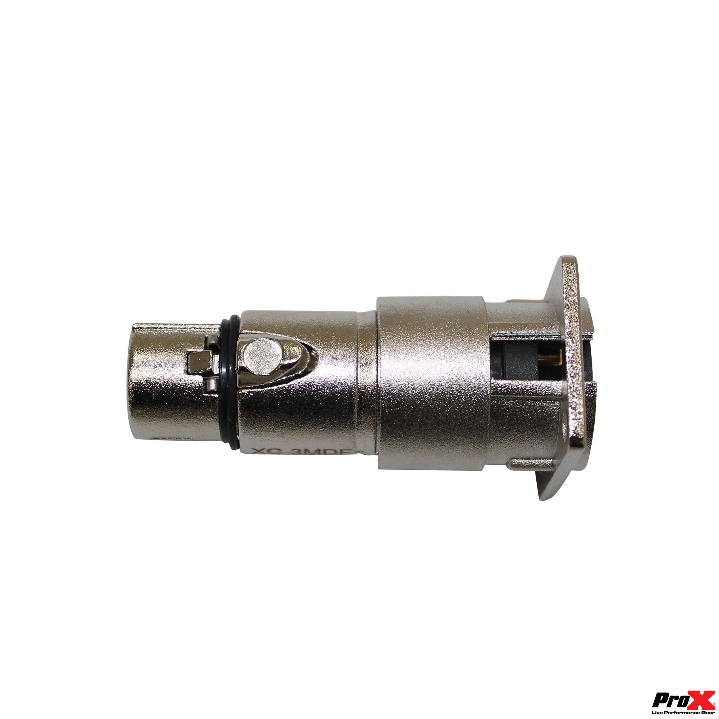 The ProX XC-3MDF XLR Male to Female Feedthrough Adapter for Panel Mount from ProX is designed specifically for the kinds of wall panels often utilized in mobile gear and on stage. It features a zinc diecast chassis and a steel-element latch-locking device. This adapter offers a 3-pin XLR male on the panel side and a 3-pin XLR female on the back side.