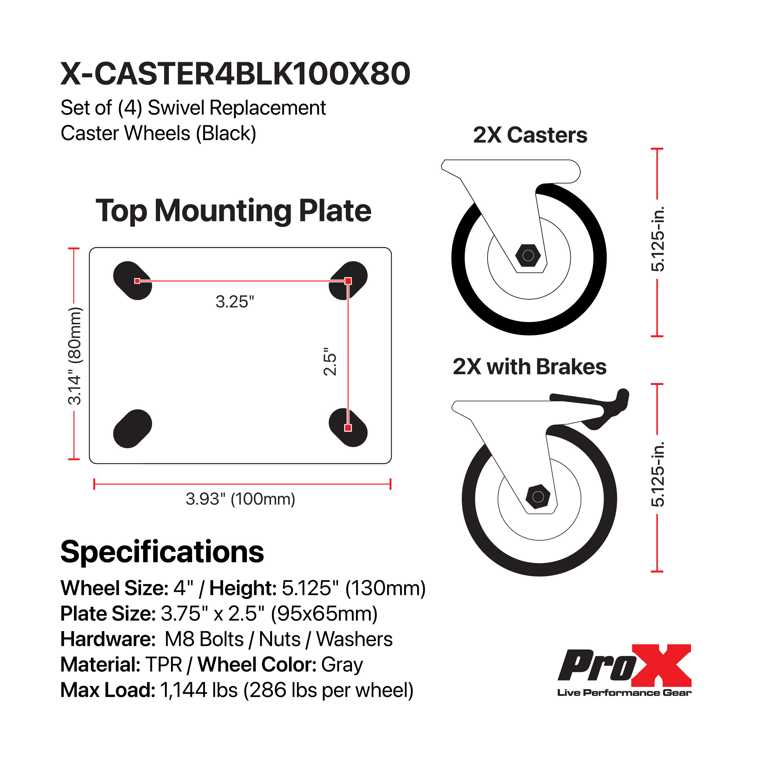 The X-CASTER4BLK100X80 is comprised of four robust 4-inch Black Industrial Grade Caster Wheels tailored for the ProX Universal ATA Flight Case - Plate measuring 3.93 x 3.14 inches.