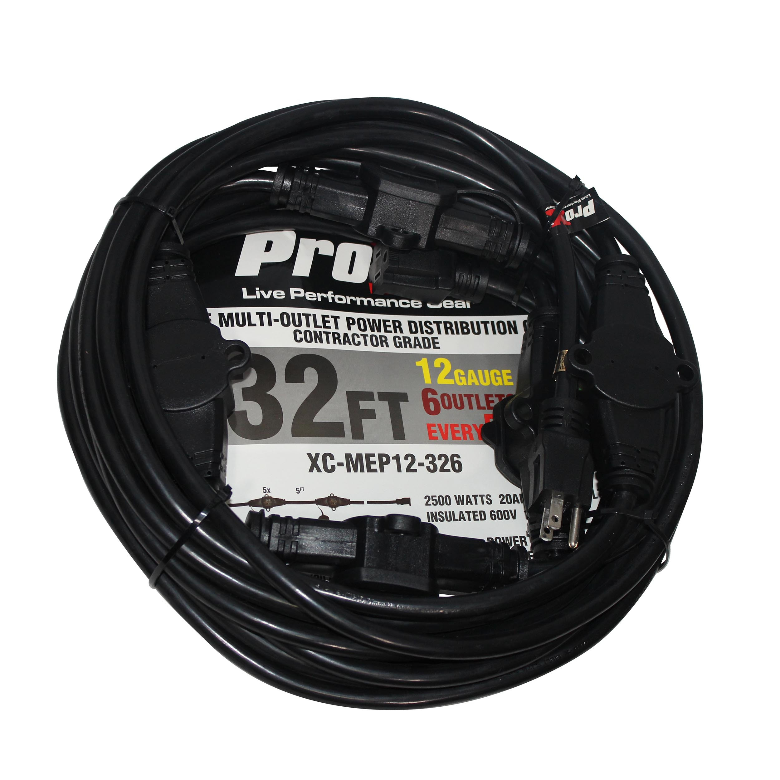 This ProX XC-MEP12 120 VAC NEMA 15 Male to 6 Socket Female Extension/Power Cord provides uncompromised signal power and frequency handling high-performance 12/3 AWG.