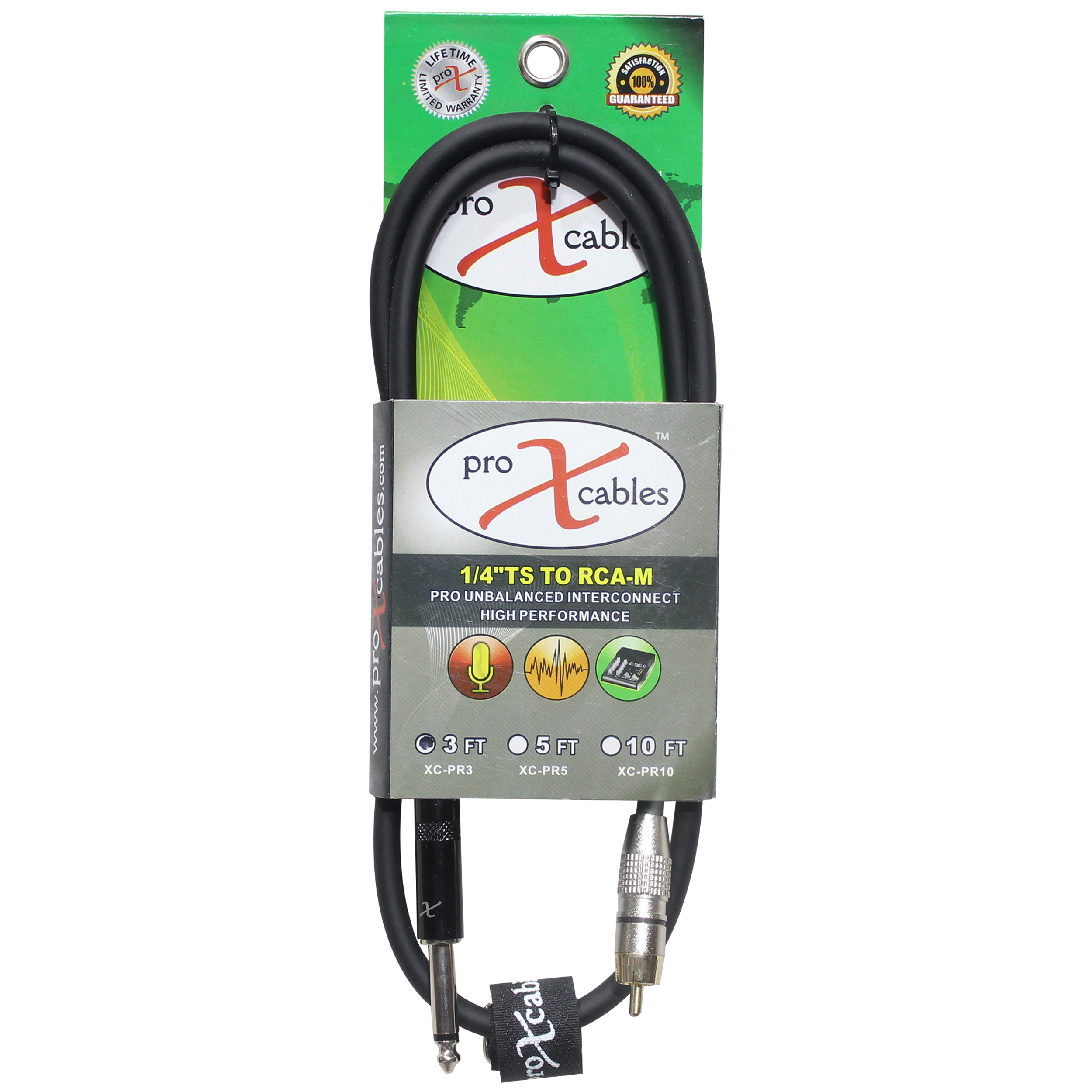The ProX XC-PR03 is ideal for professional touring and live sound applications where a device with a RCA output/input needs to be connected to a device with a TS 1/4" output/input. 93% braided OFC Copper Compact shield to reduce noise and protect pure sound transfer. Compact cable diameter to decrease eddy currents.