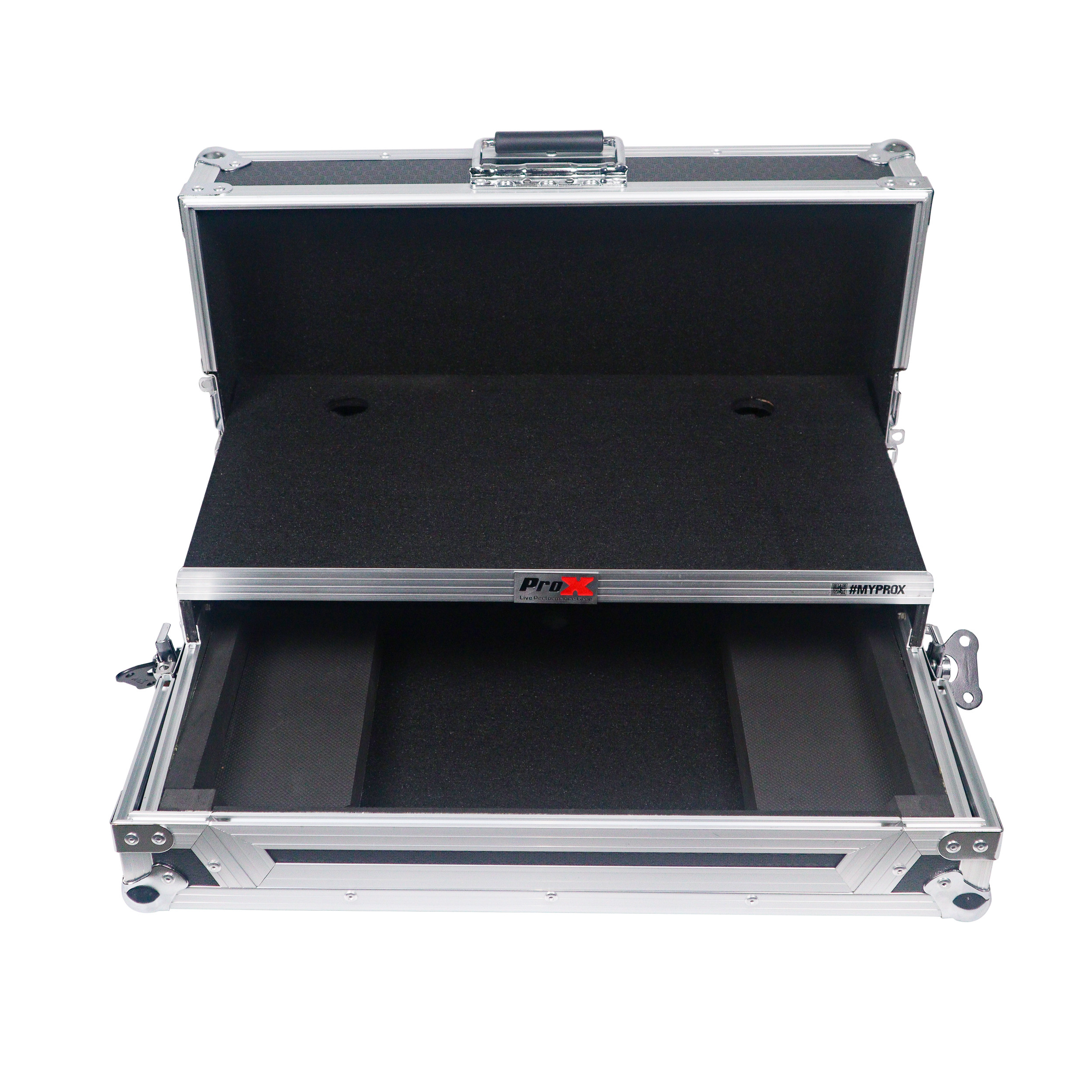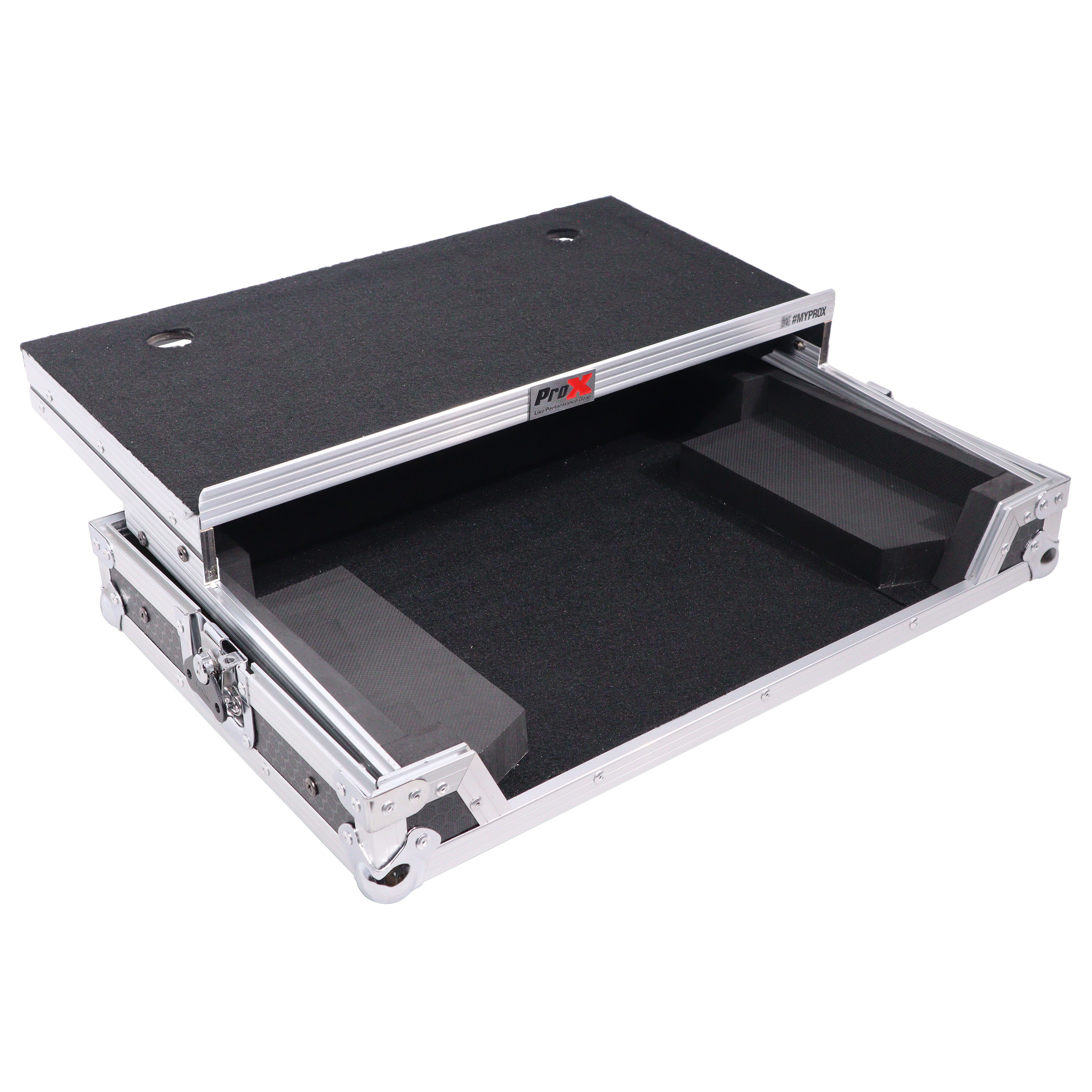 Gig-Ready' SeriesProX Gig-Ready' Series cases are constructed from rugged 3/8" Plywood, reinforced with steel ball corners, spring-loaded recessed padded handles, and twist-locking latches. There is additional space for cables and small accessories at the rear underneath the controller for convenience. The removable front panel allows for easy access to the DJ controller front control knobs, headphones, mic jacks, etc.
