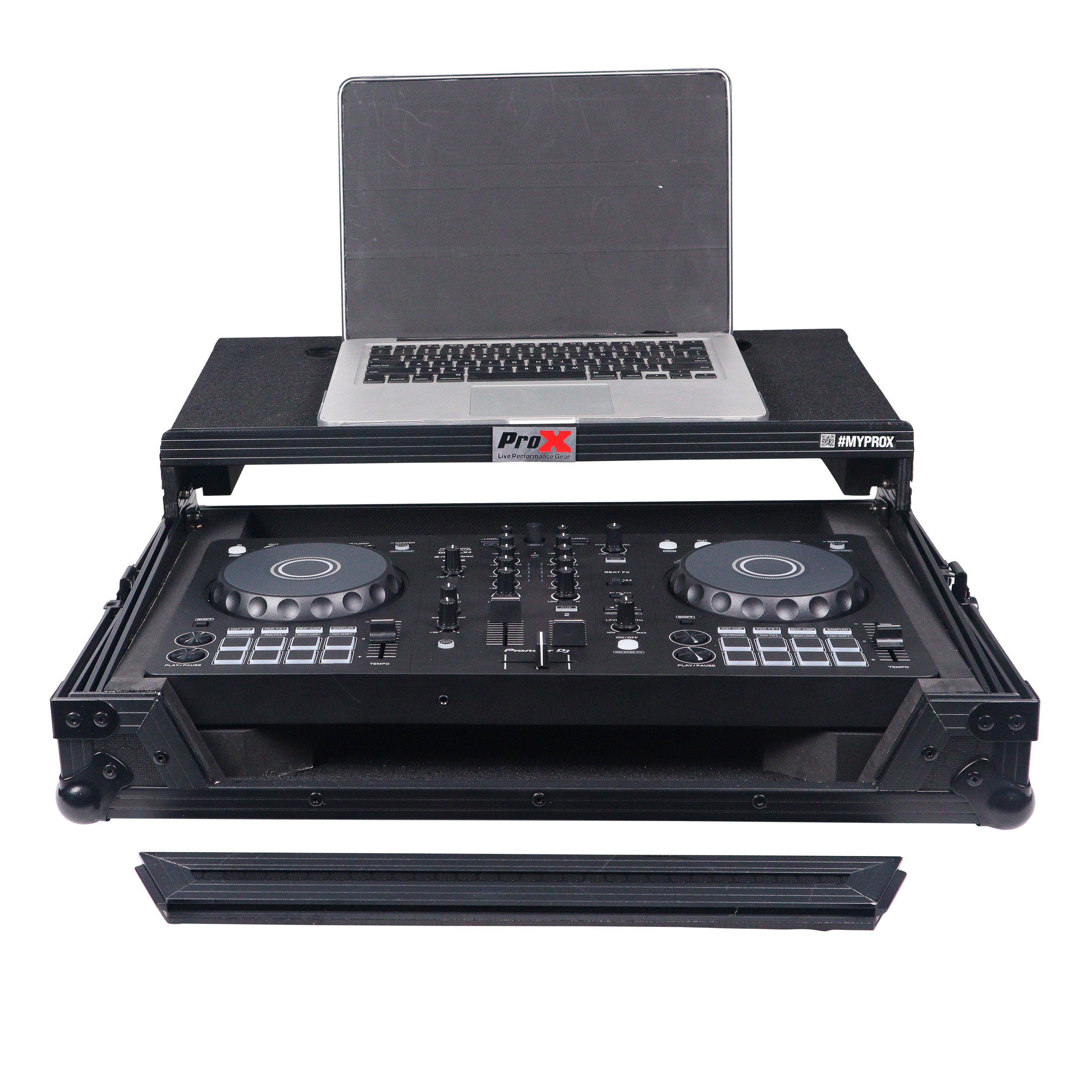 Gig-Ready' SeriesProX Gig-Ready' Series cases are constructed from rugged 3/8" Plywood, reinforced with steel ball corners, spring-loaded recessed padded handles, and twist-locking latches. There is additional space for cables and small accessories at the rear underneath the controller for convenience. The removable front panel allows for easy access to the DJ controller front control knobs, headphones, mic jacks, etc.
