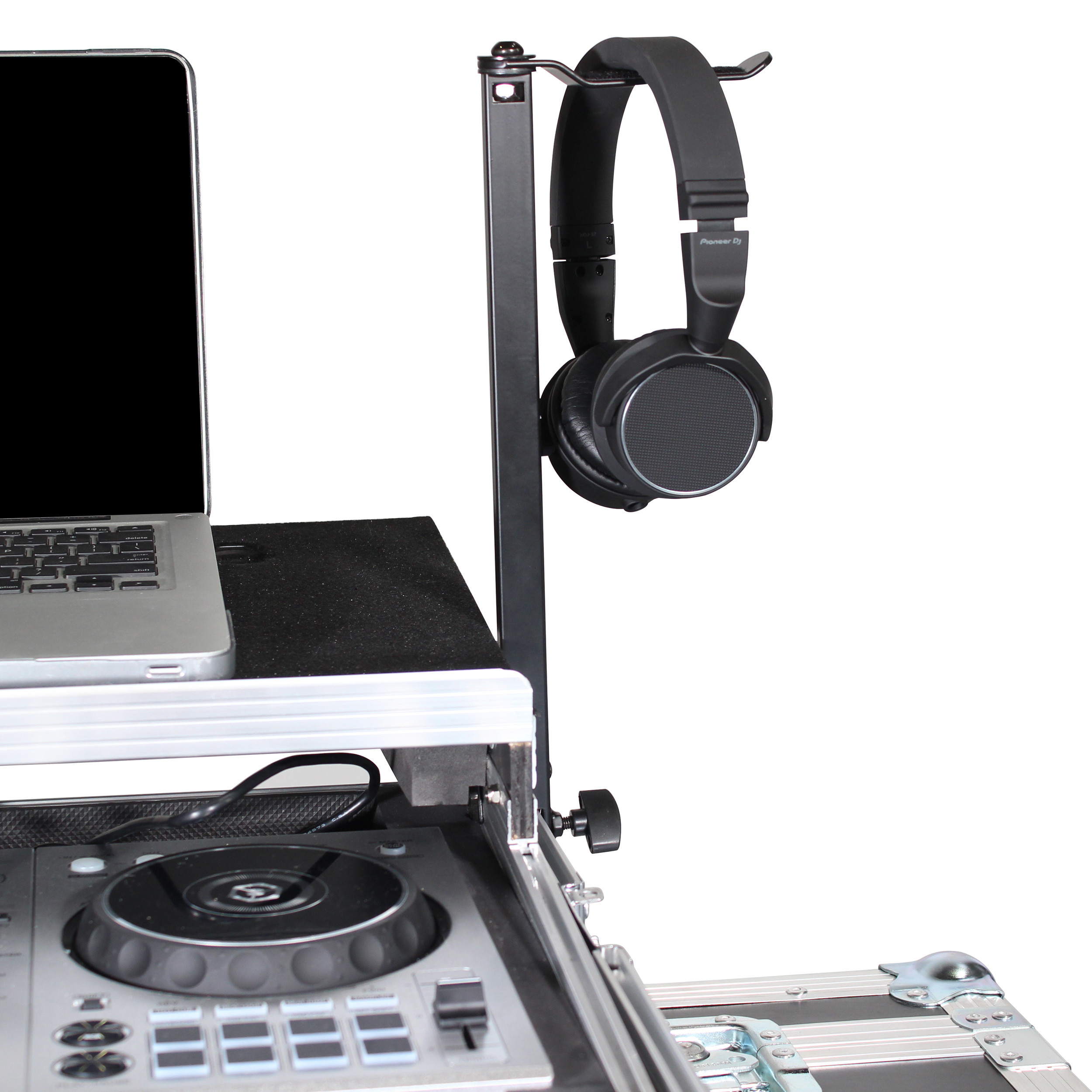 The easy to attach unit has an easy thumbscrew clamp at the bottom that will fit virtually any flight case vertical side. The rotating hangar bar is on a nylon tensioned connector to hold your headphones in any position you find convenient. The compact structure and small volume saves space. It is easy to bring along wherever you go.