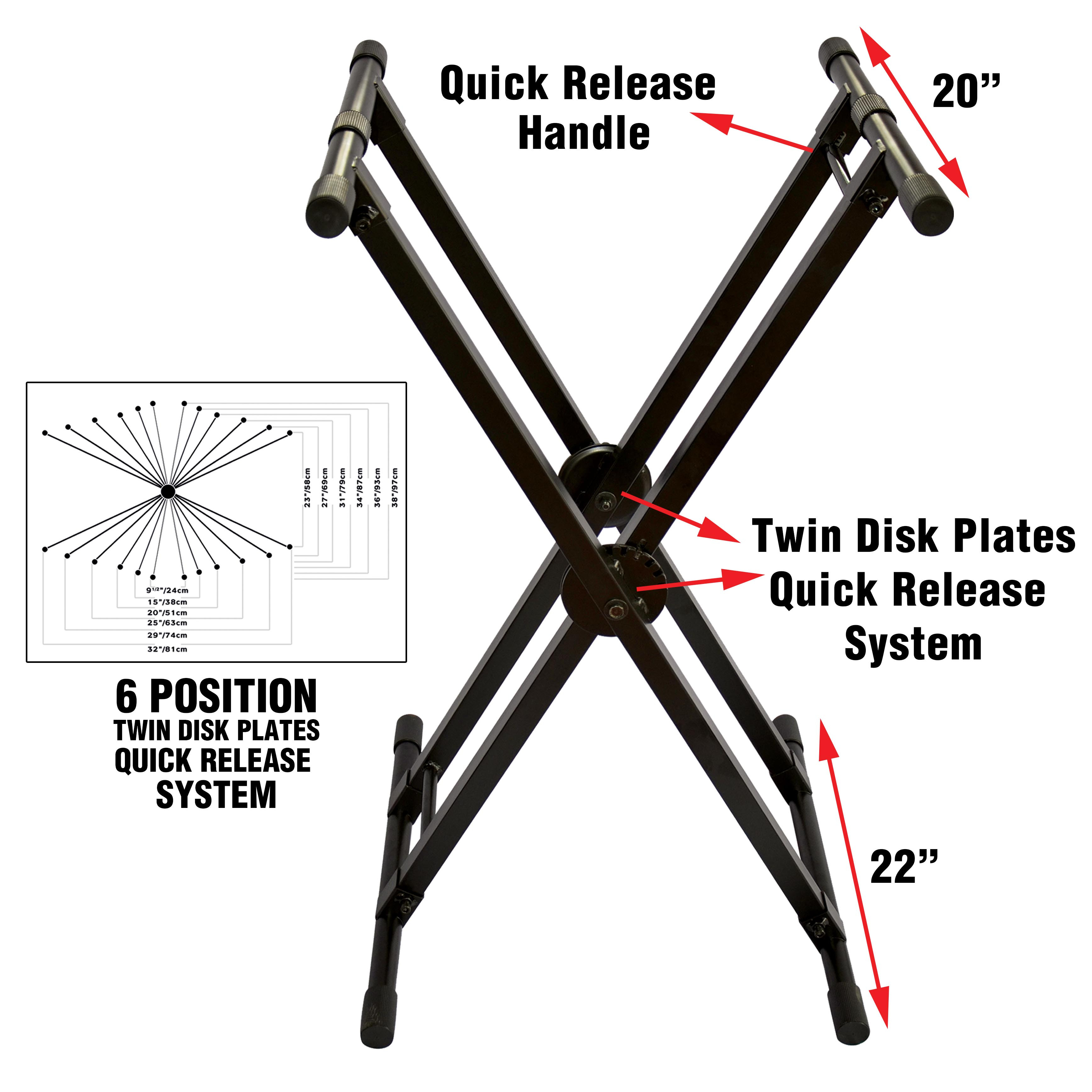 The ProX T-KSD22 is a quick-release X-Style DJ/Coffin/keyboard stand that brings an innovative method of stability to the lightweight design and can also be used as a DJ coffin stand. The Quick Release system along with the stabilizing end caps and ergonomic easy lock features provide peace of mind to all keyboardists and DJs when it comes to saving time during event setups and breakdowns.