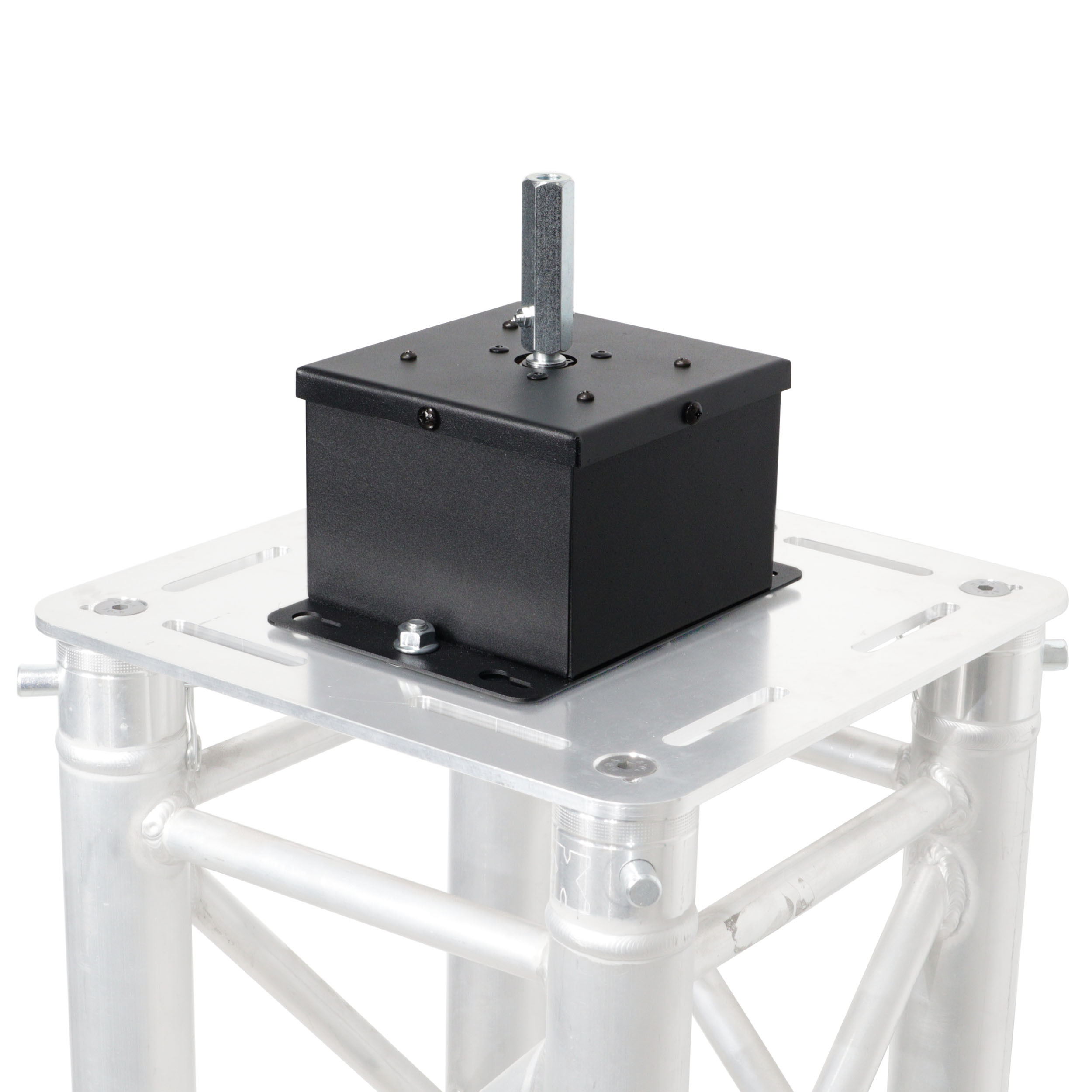 Motos' is a Mirror Ball Motor that is made to be mounted vertically in the upright position. The mounting bracket wings located at the base of the unit allow easy truss top plate connection out of the box. It can also be used in conjunction with a speaker stand mount plate adapter X-SSMP (does not support ceiling or overhead mounting).