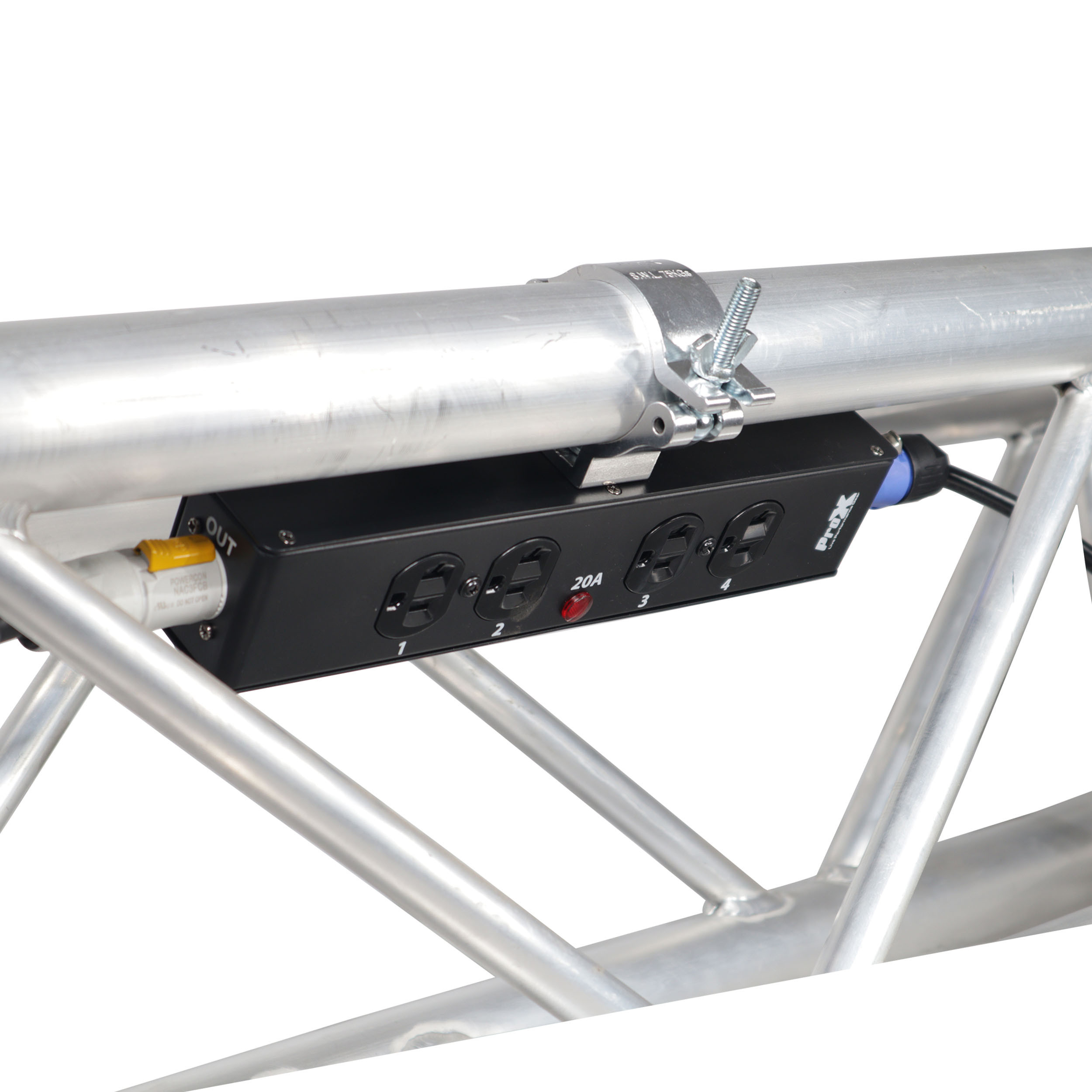 The ProX PowerCenter' Power Connector Compatible To 4X Edison Outlet (New Slim Design) is perfect to help you light up you truss rig, giving power to your mobile dj setup, this is the heavy duty Power Center you need to add to your equipment. Equipped with a 20A inlet and outlet Power Connector compatible connections. making it easy to link two or more of these along a truss system or even for sound systems. Having four Edison Prong Outlets in total to have a total of 20A all together. It also contains a M8 threaded hole to allow you to use clamps and adapters to hang the PowerCenter.