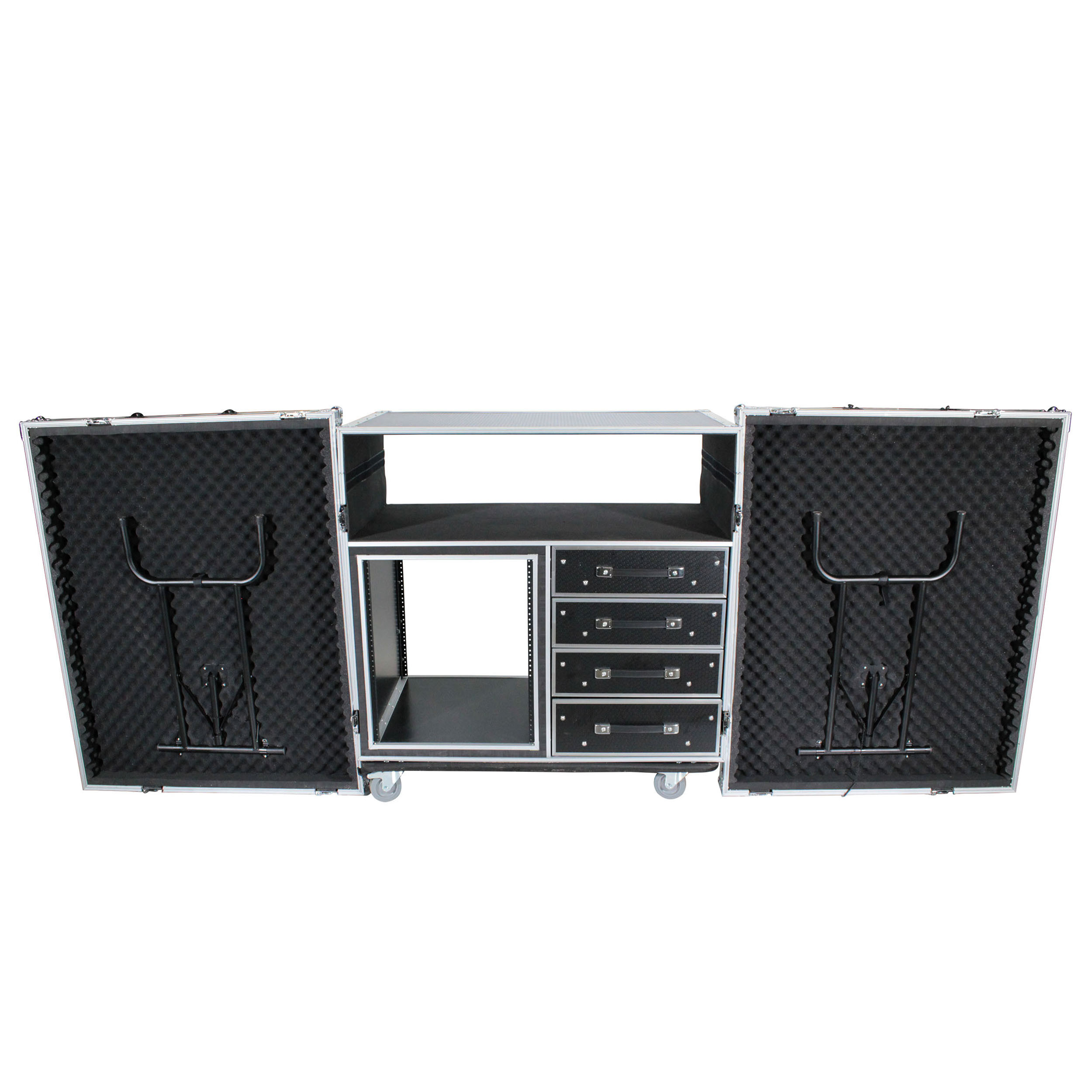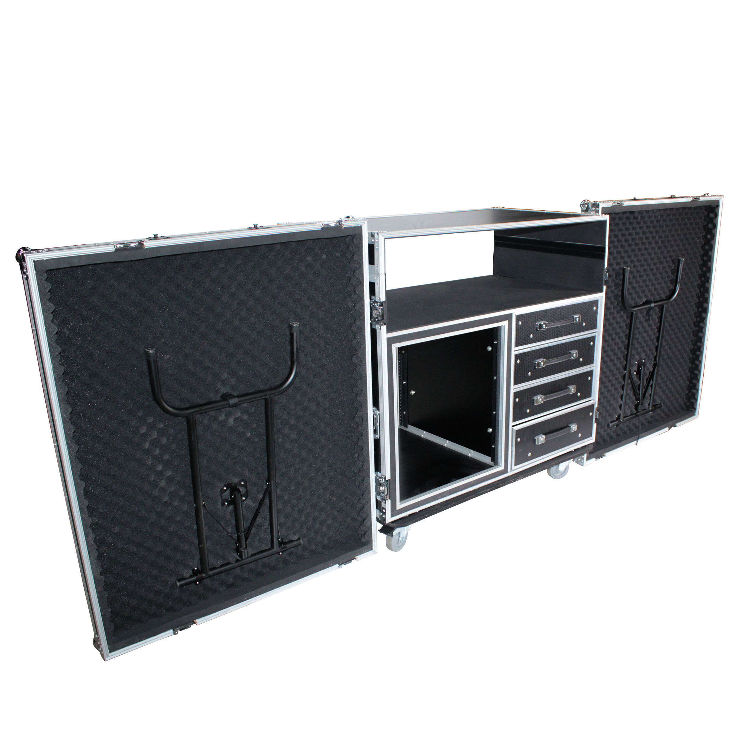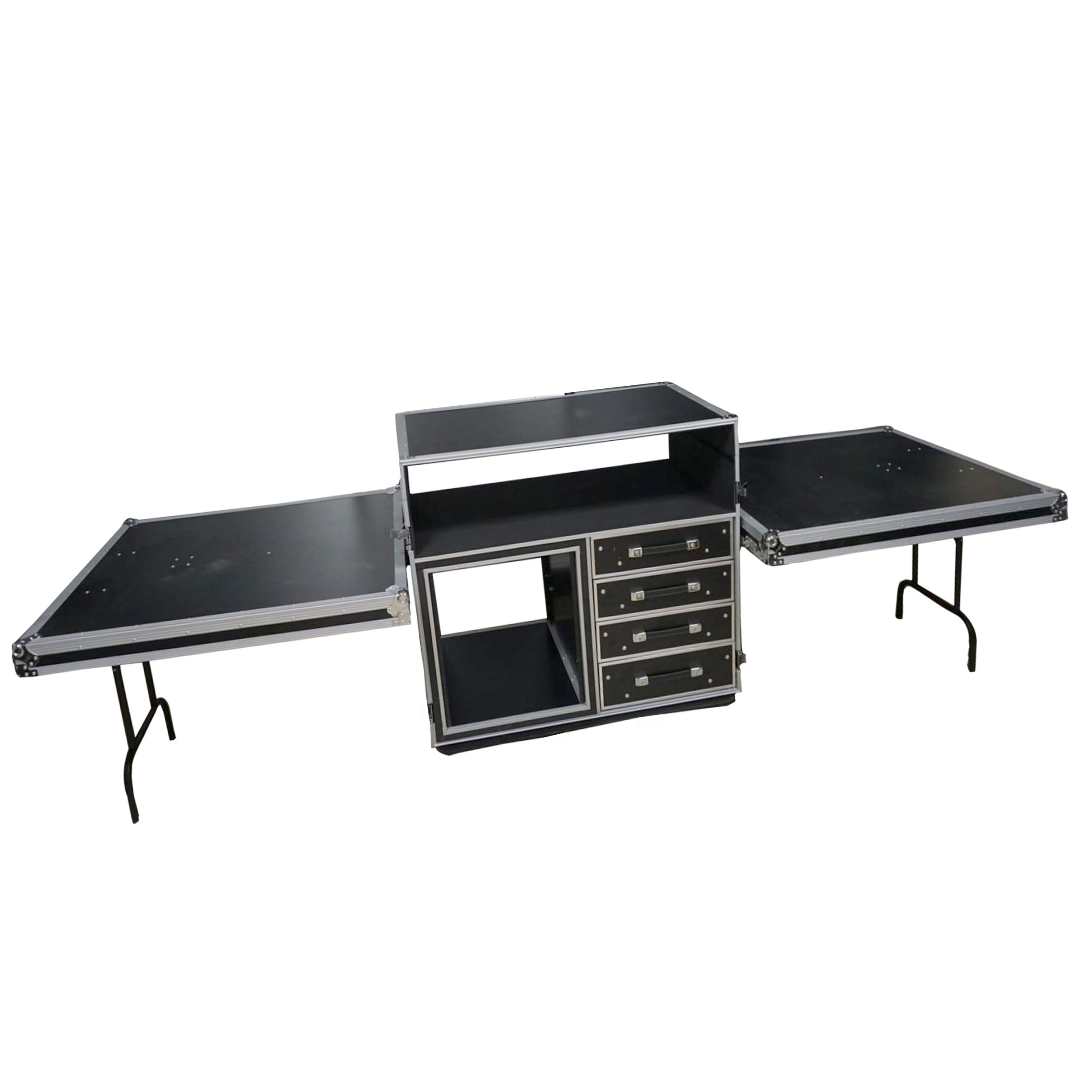 This case features four, easy to open drawers and two side work tables to keep your gear organized and easily accessible for your professional events. The other side has a 12 Unit Rack Space that can be loaded from either side depending on your needs.