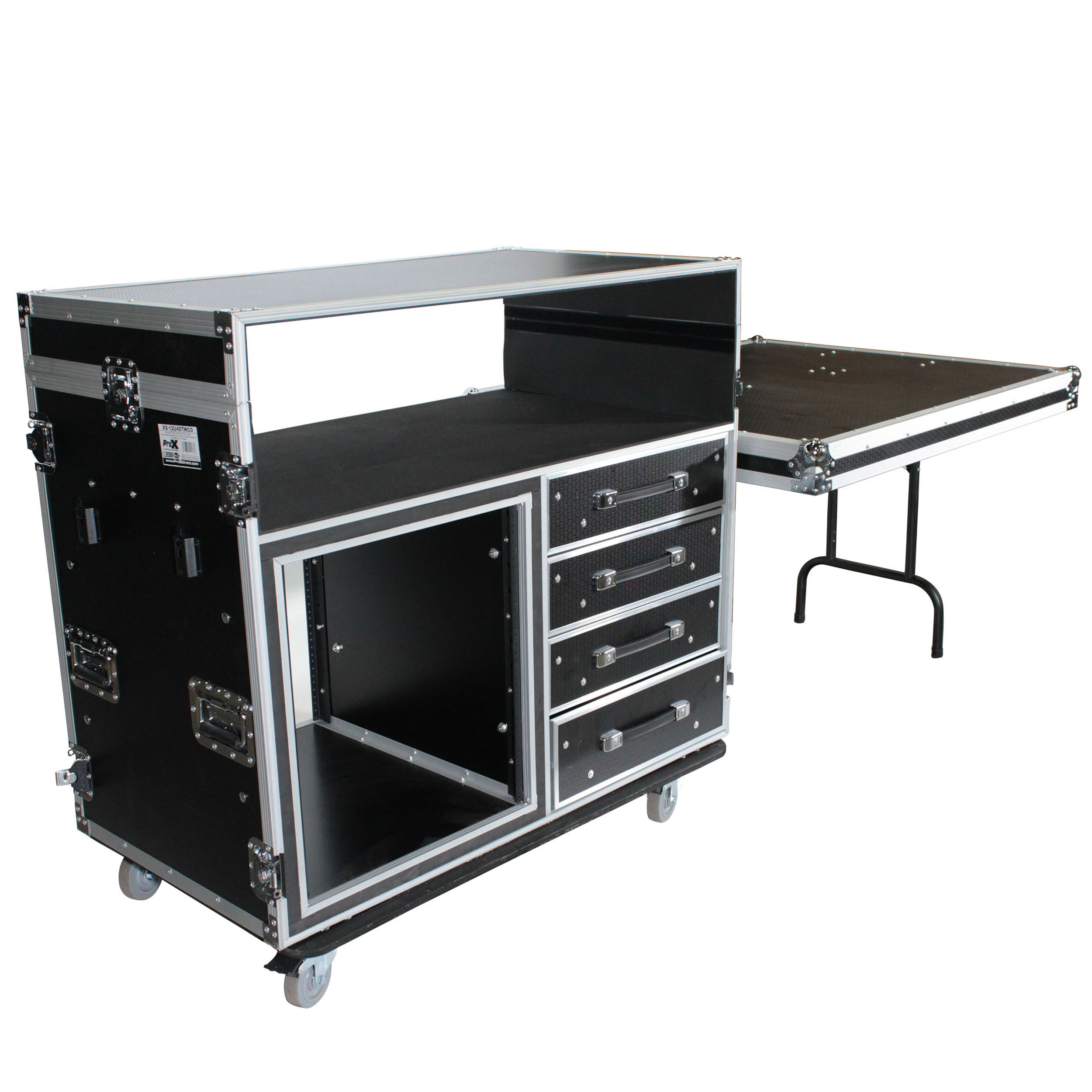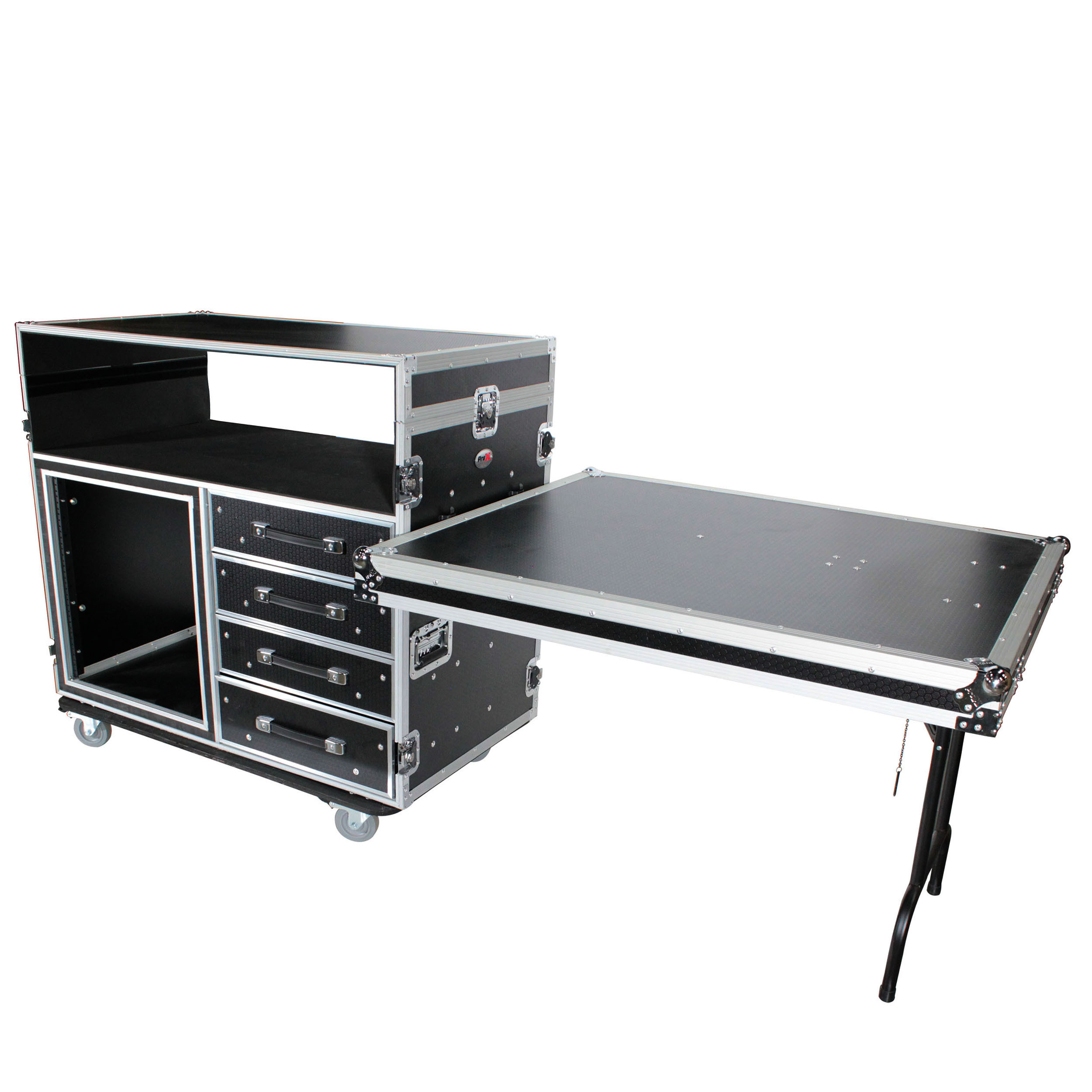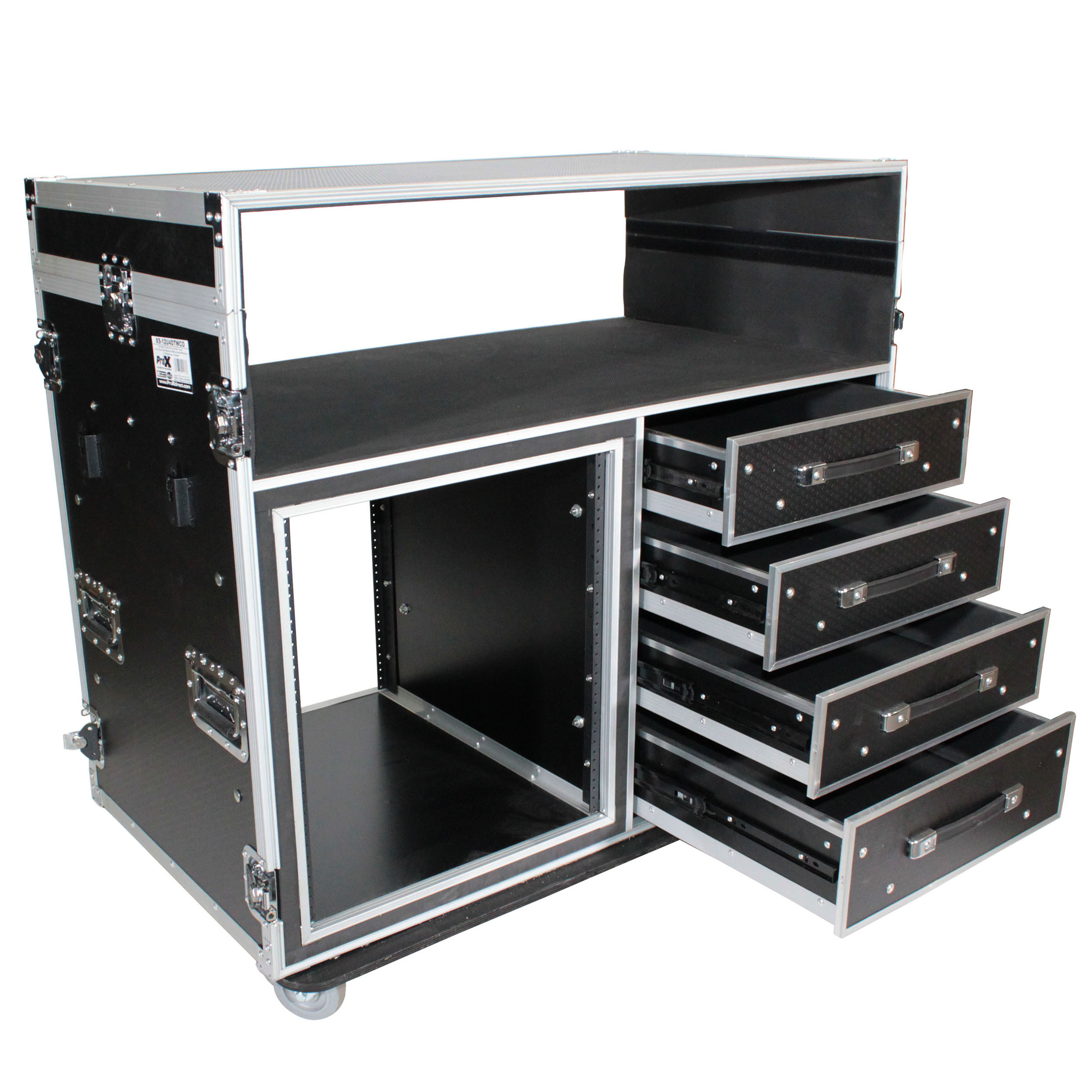 This case features four, easy to open drawers and two side work tables to keep your gear organized and easily accessible for your professional events. The other side has a 12 Unit Rack Space that can be loaded from either side depending on your needs.