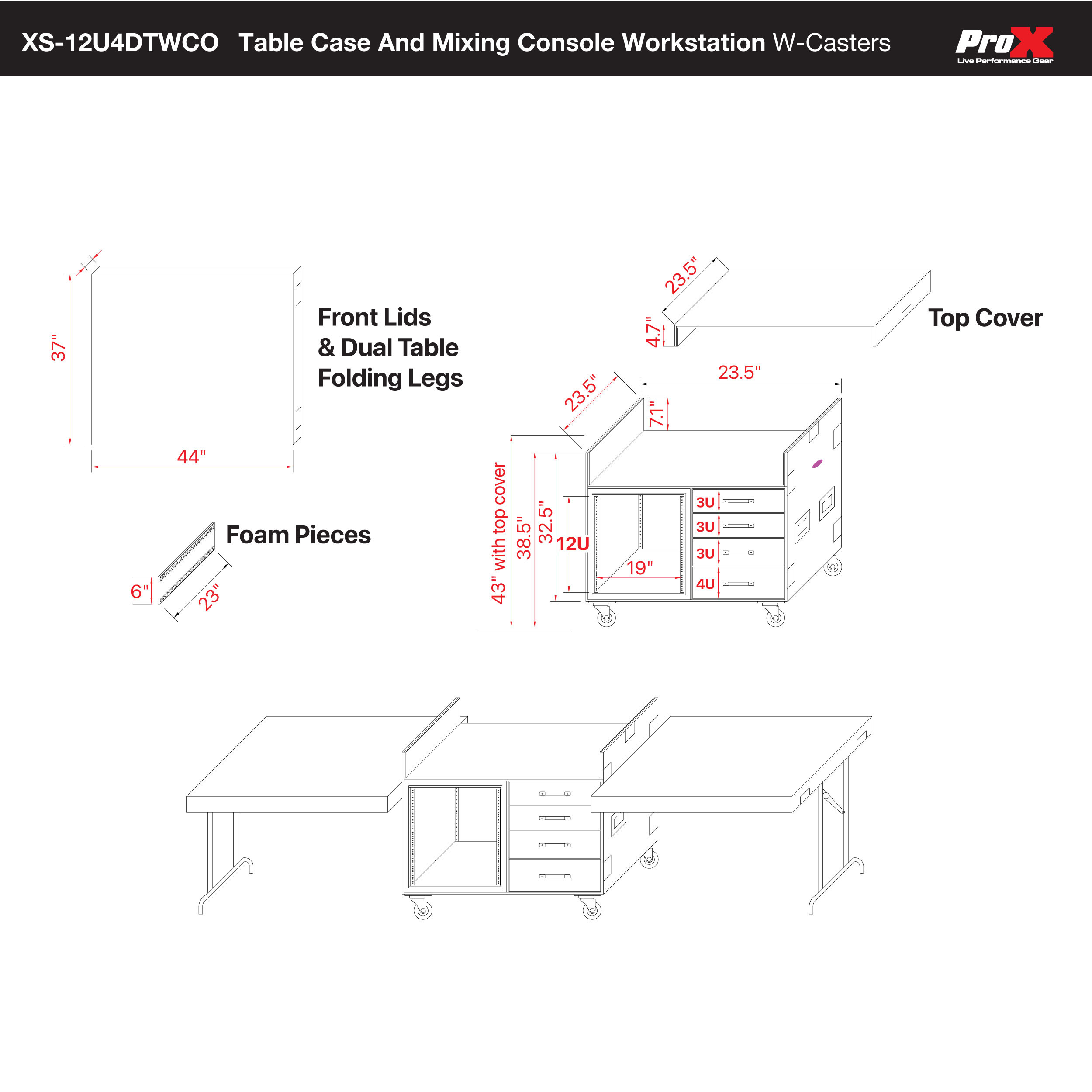 The ProX XS-12U4DTWCO Dual-Table Case And Mixing Console Workstation with two side tables is your workshop on wheels. The XS-12U4DTWCO Workstation Case is constructed with our Signature Series Plywood, durable handles and pulls, and reinforced steel ball corners for years of on the road use.