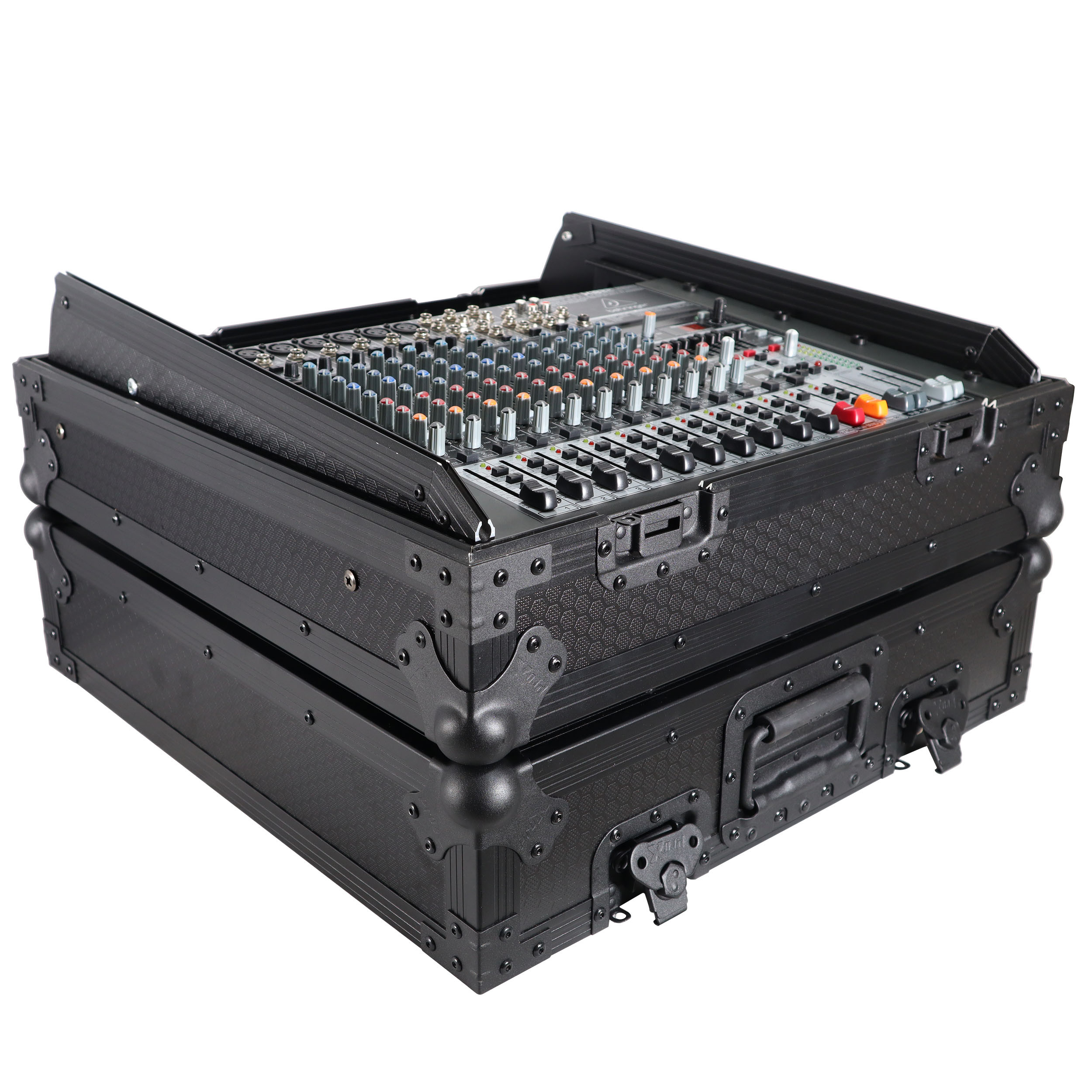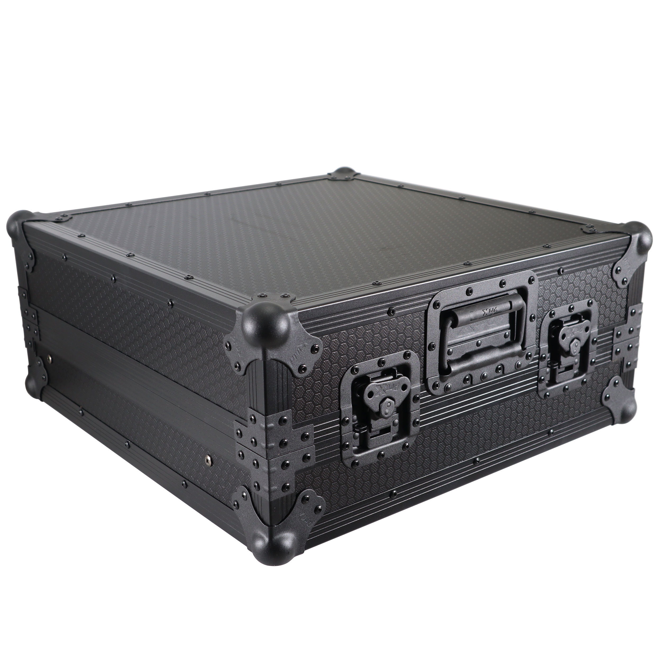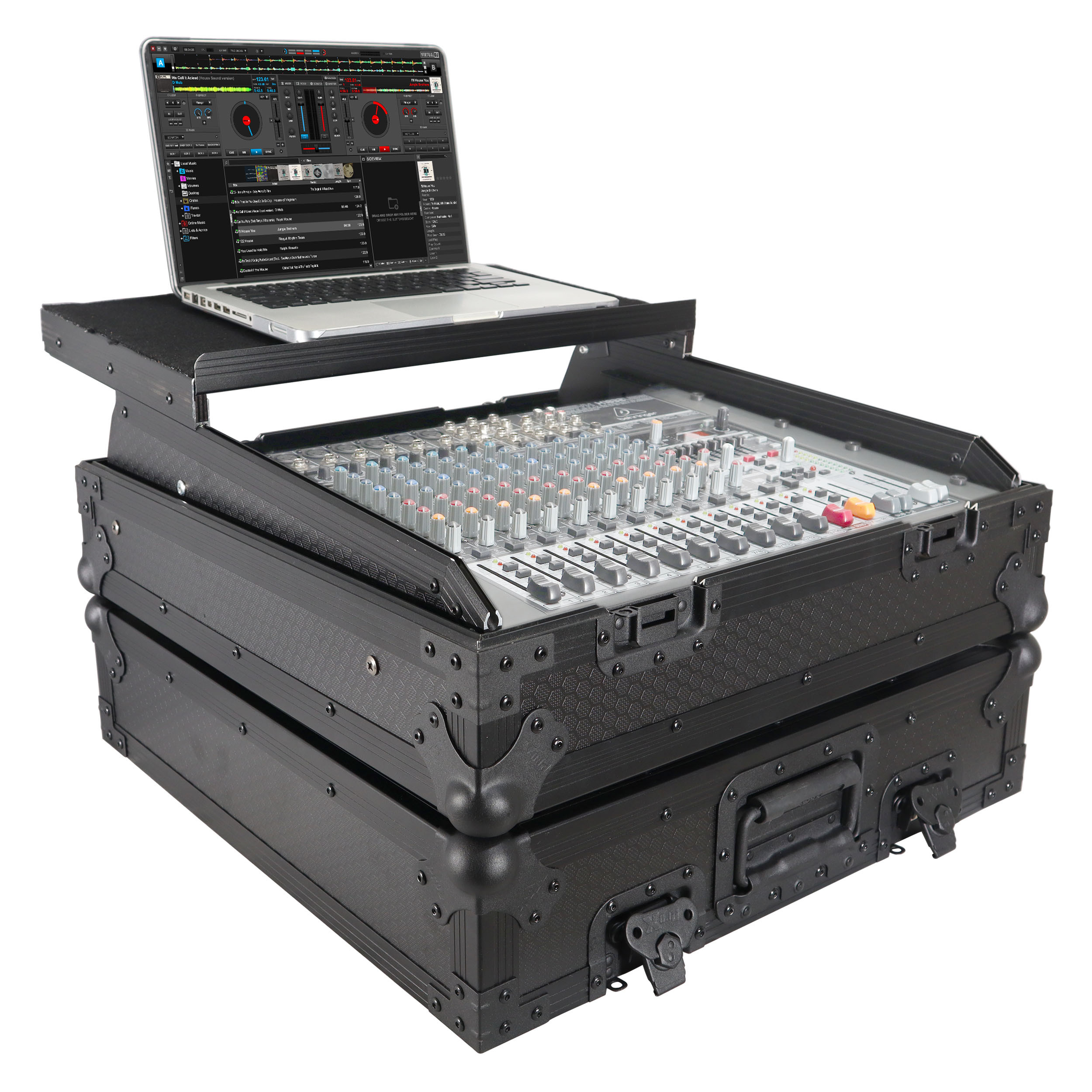 This 10U 19 inch Slant ATA 300 style rack mount Black on Black case is perfect for the mobile DJ. If you need protection for your investment, then look no further. The sliding laptop shelf saves table space, and gives the best access to all of your gear. The removable cable access cover allows you to lock the case while keeping your gear connected, and offers a clean look. Signature Series laminated plywood ensures the best protection and peace of mind. Comes with mounting hardware.