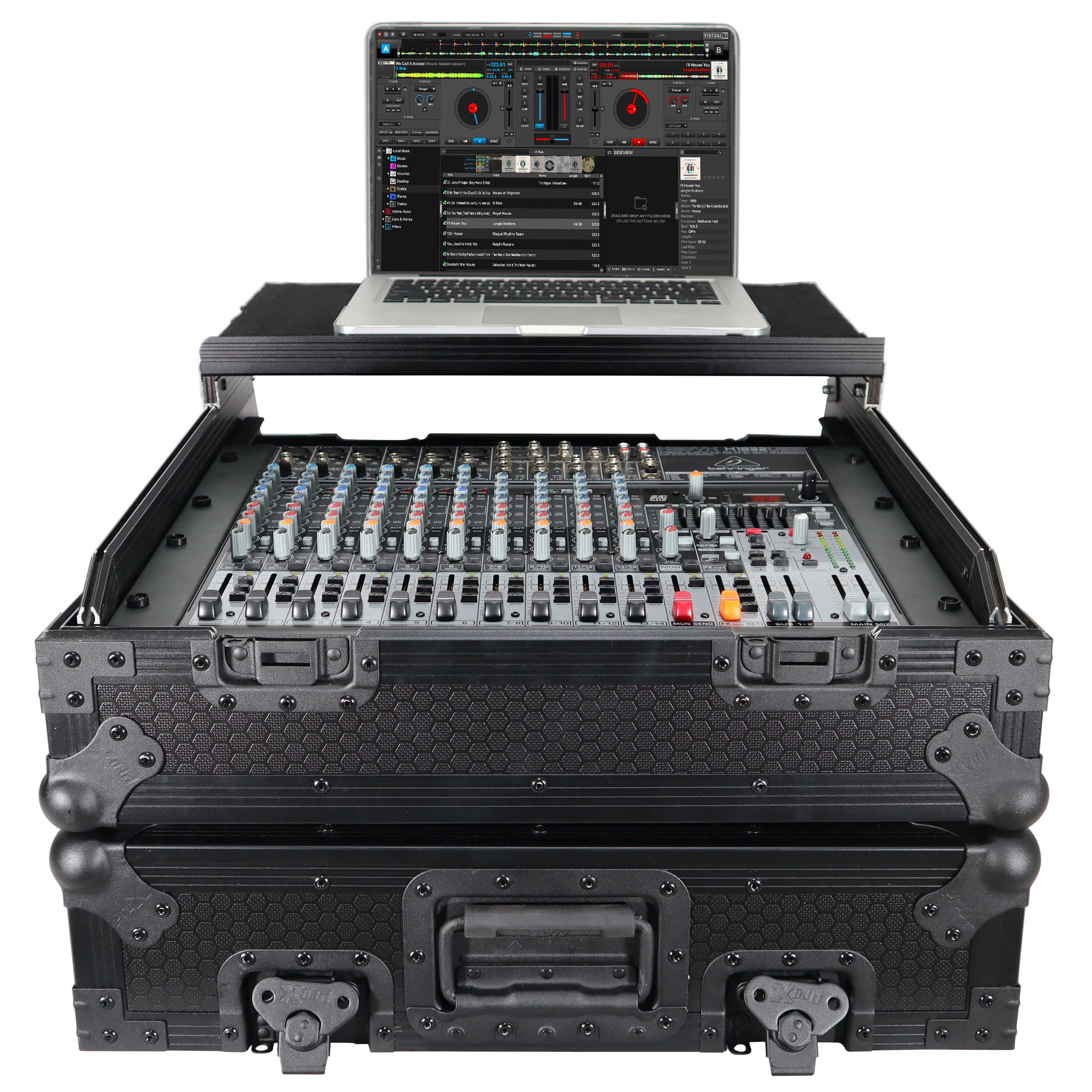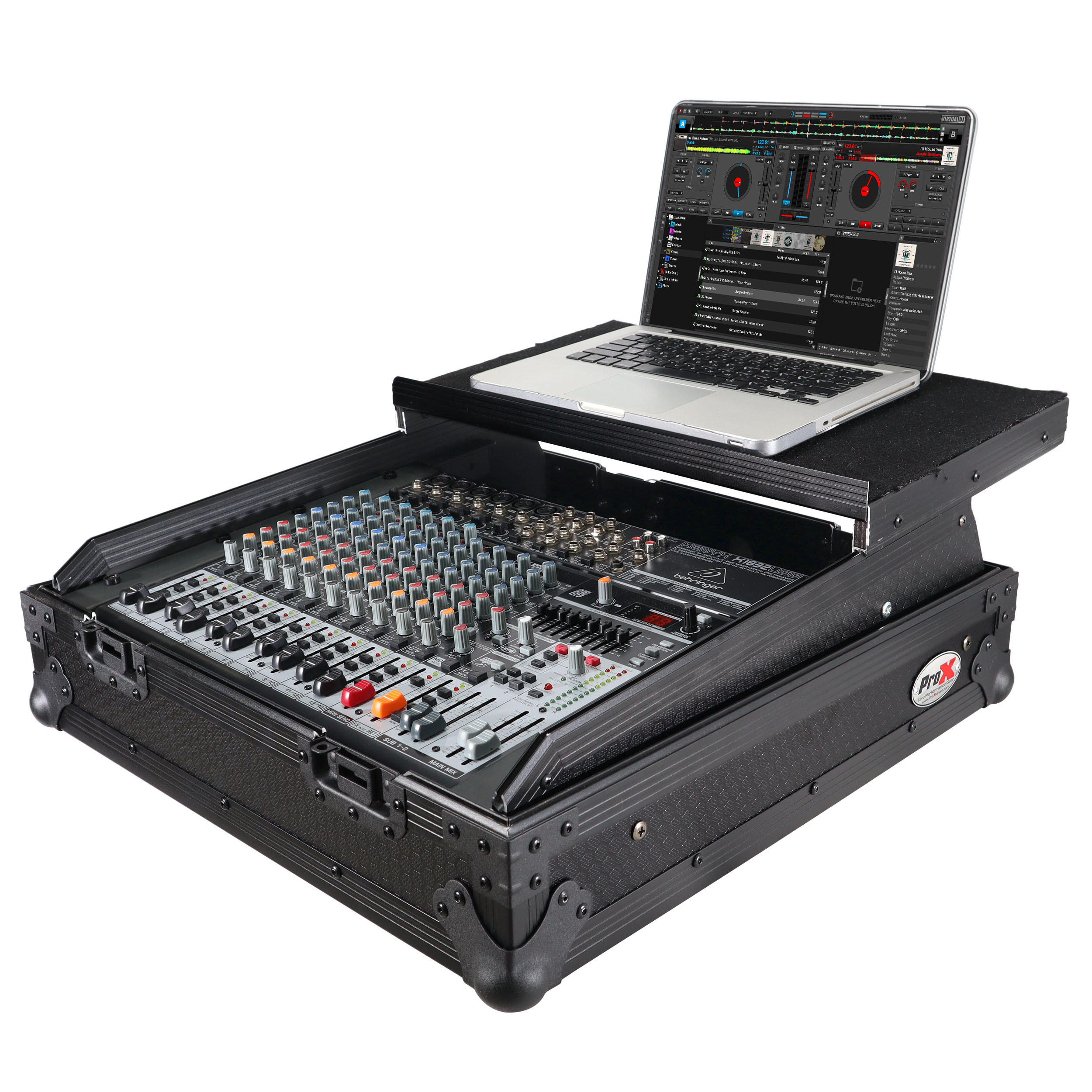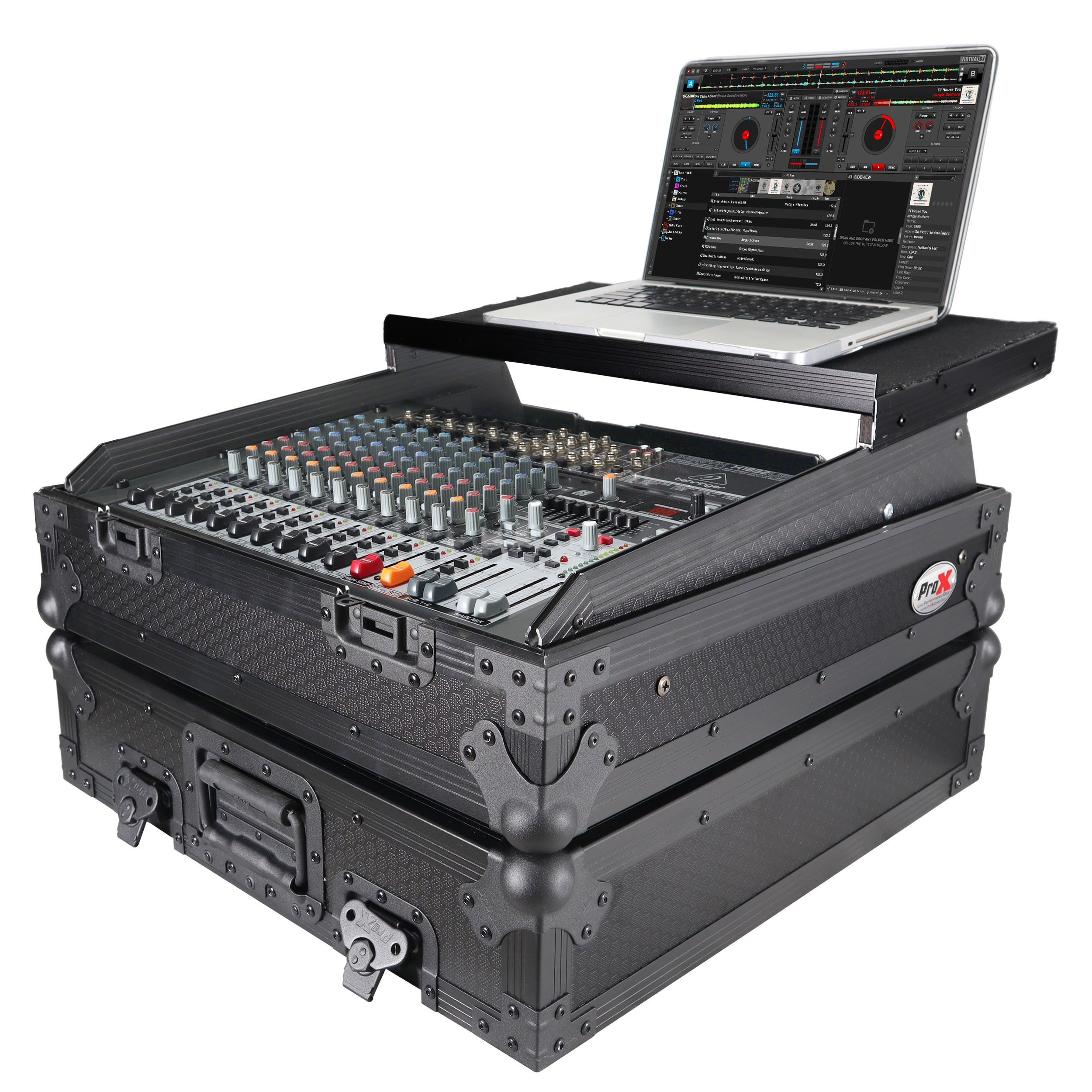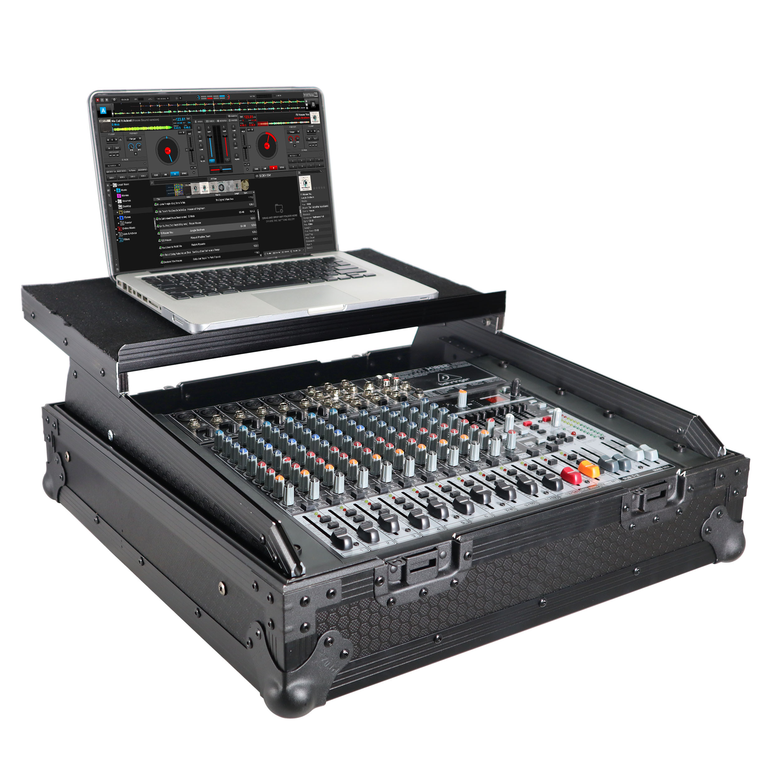 This 10U 19 inch Slant ATA 300 style rack mount Black on Black case is perfect for the mobile DJ. If you need protection for your investment, then look no further. The sliding laptop shelf saves table space, and gives the best access to all of your gear. The removable cable access cover allows you to lock the case while keeping your gear connected, and offers a clean look. Signature Series laminated plywood ensures the best protection and peace of mind. Comes with mounting hardware.