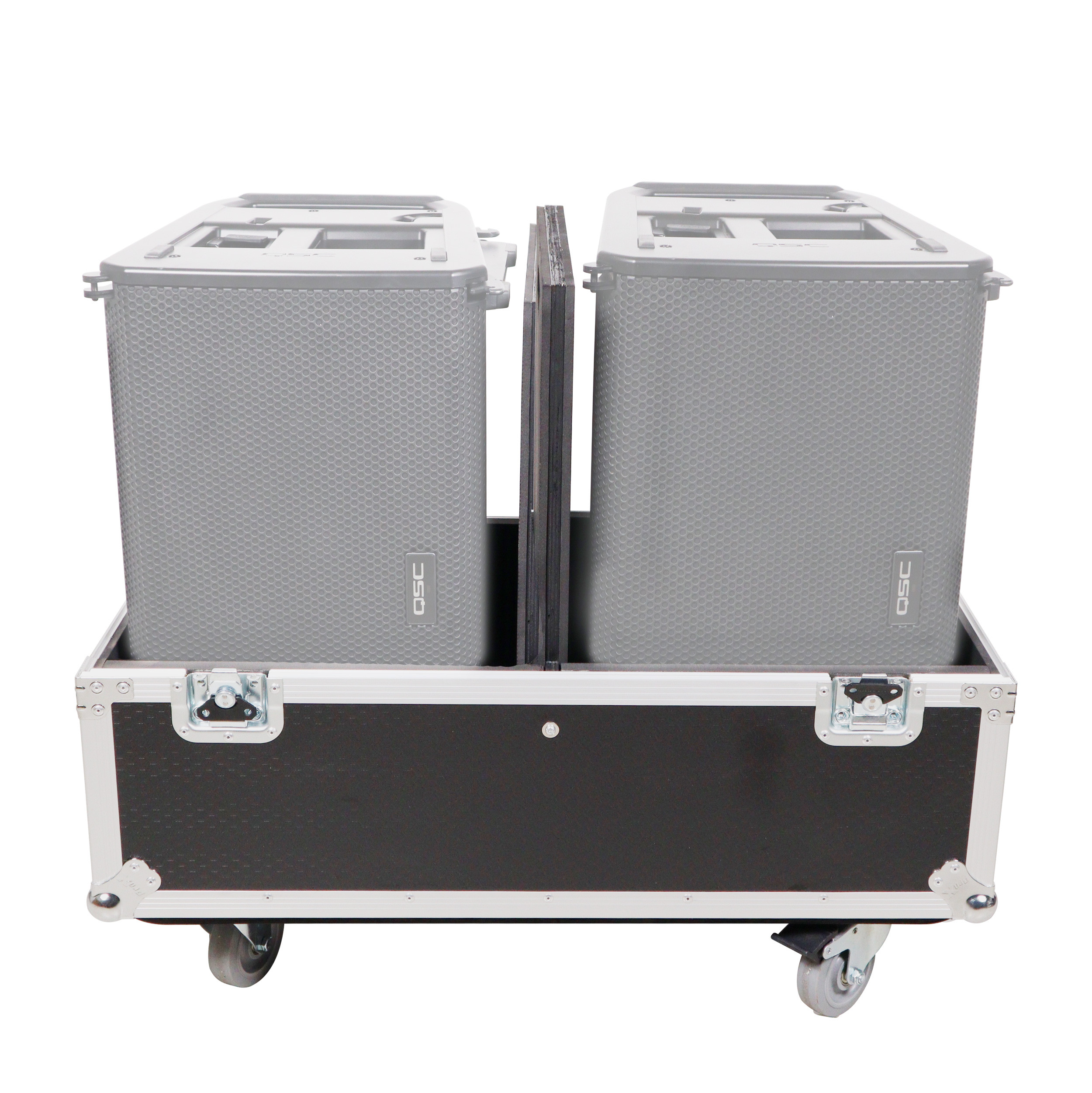 ProX XS-2X251715W Universal ATA Flight Style Speaker Case with 4" with Single Divider 4 inch Casters and Label Tray. This Universal Pro Speaker case is designed to protect your speakers. It features a 3/8" laminated plywood with a hard shell and internal impact-resistant padding, ensuring the best protection for your speakers during transit or storage. This universal case fits up to (2) speakers, with interior dimensions of 25" H x 17" W x 15" D.